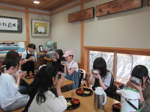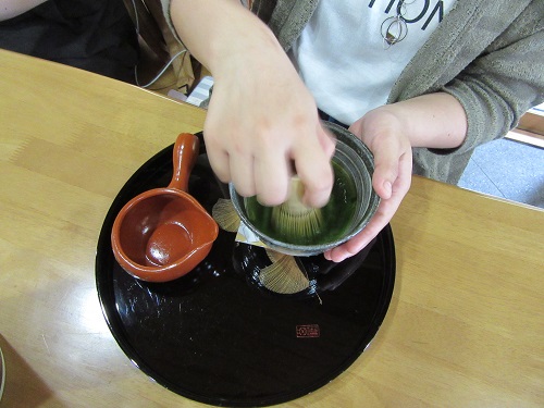 みな、自分たちの手で美味しい抹茶を点(た)てていました(本学には、お茶室もあります)。