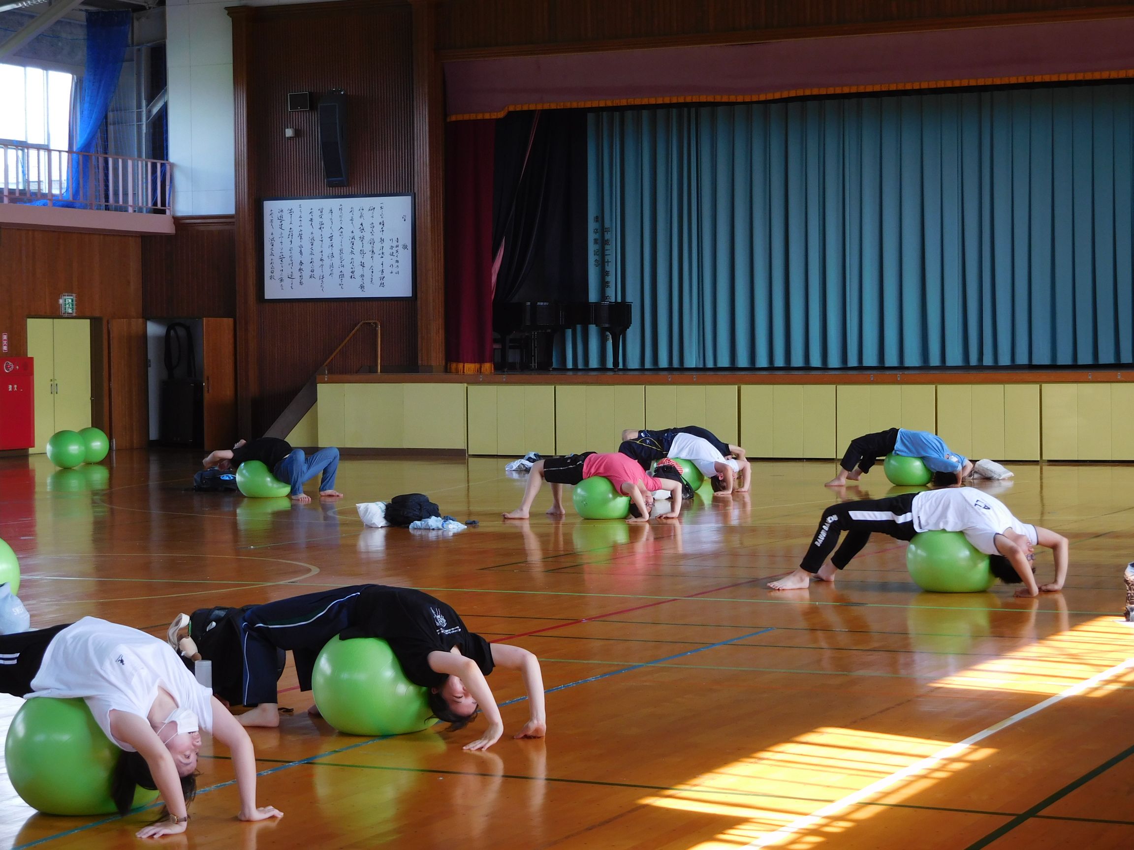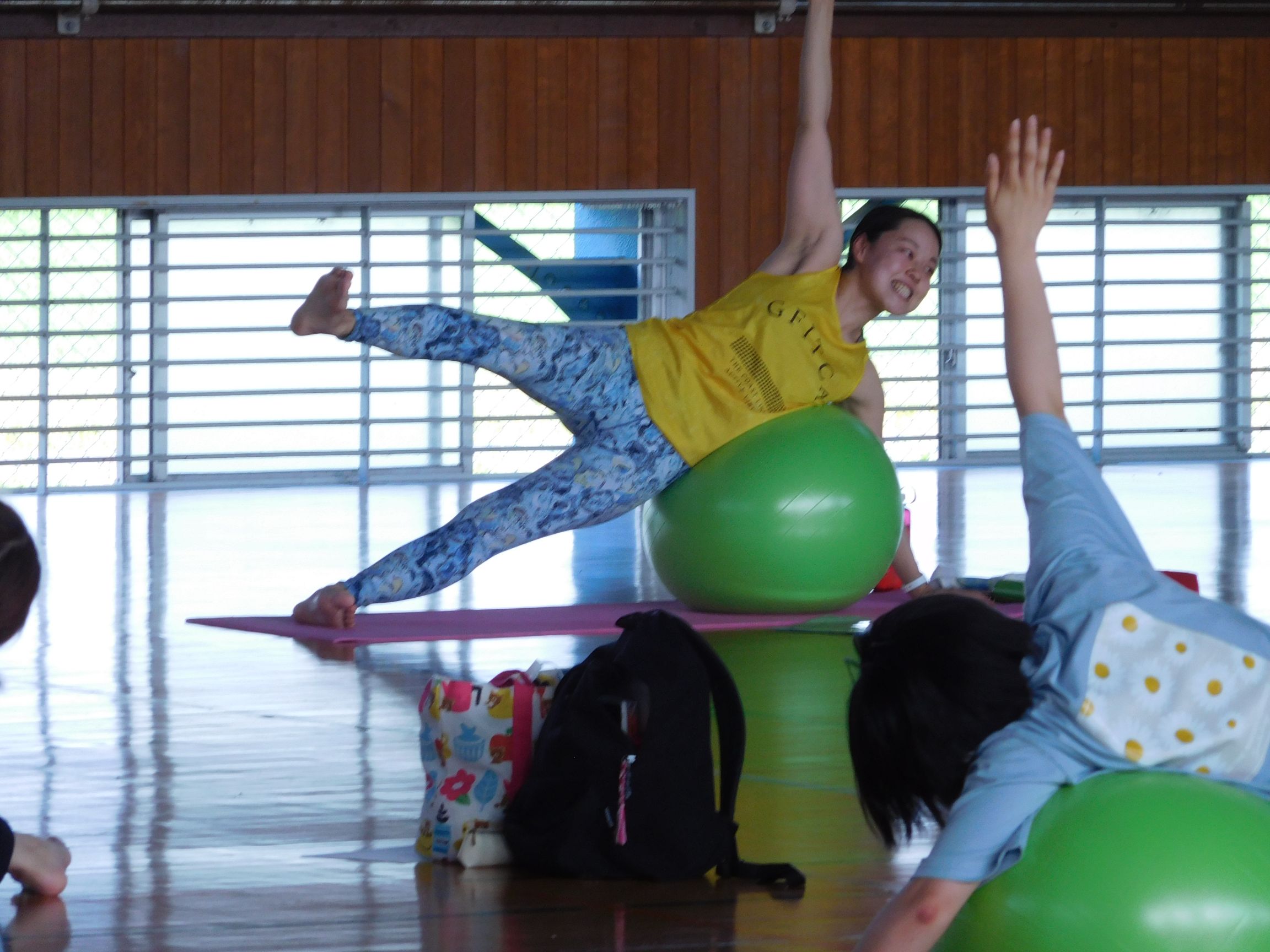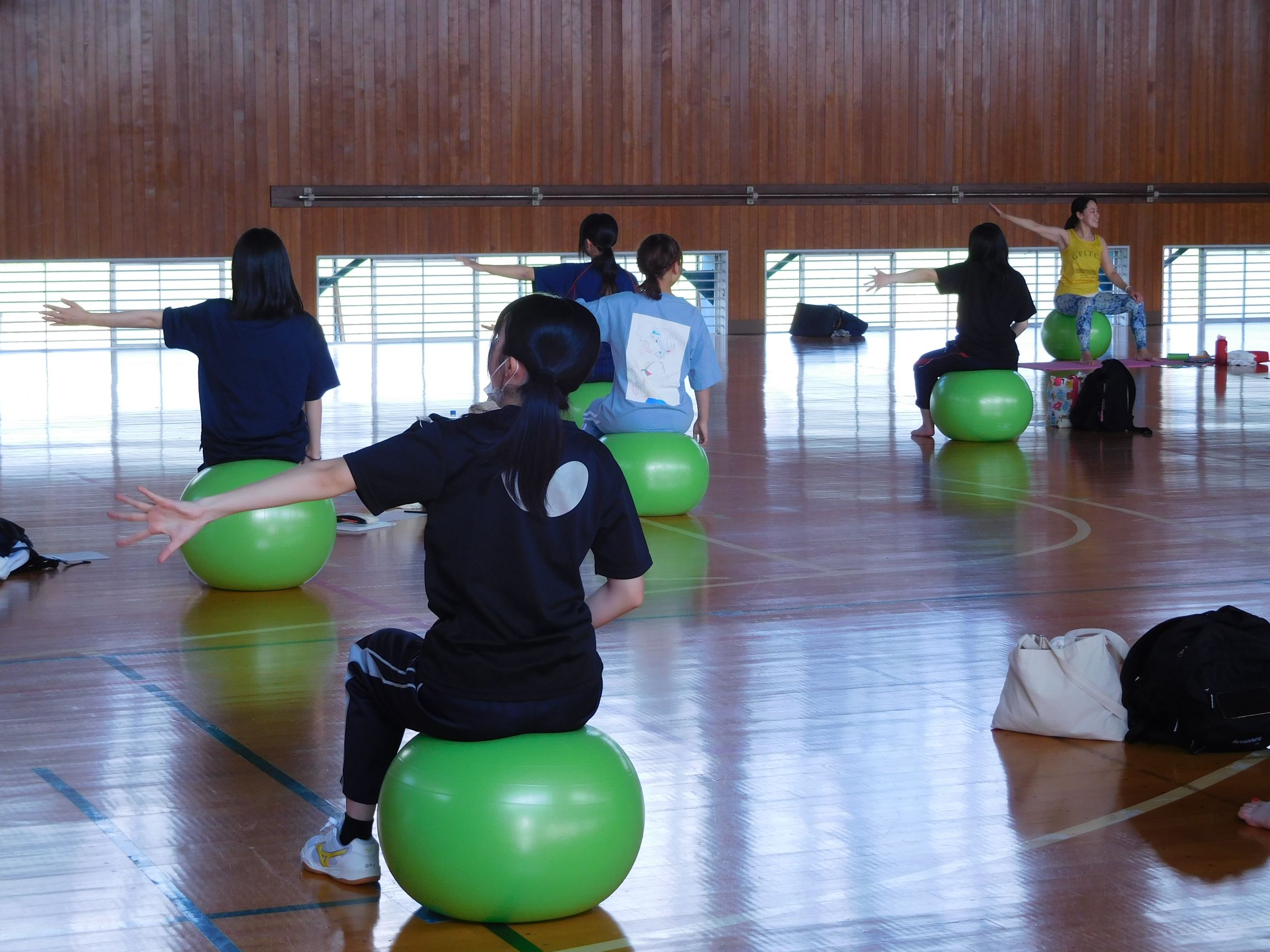 また、カラダについて学び、自分のカラダに目を向けるように意識してもらい、バランスボールエクササイズがスタートしました。