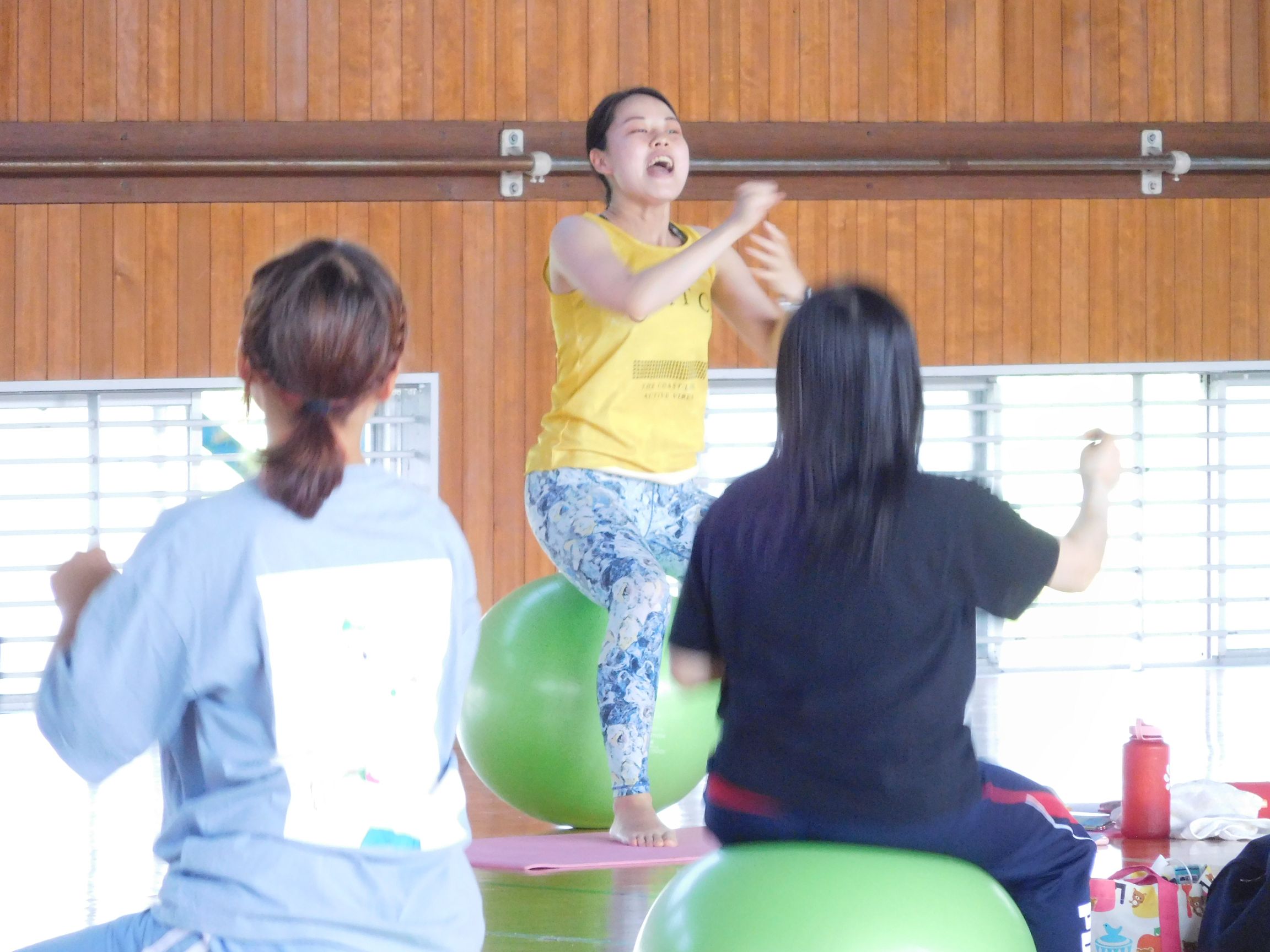 座学ではマインドマップを使用した思考整理術や、カラダのプチ不調を自分で整えるセルフケア方法などを学び、実技としてバランスボールを使用したエクササイズを伝えています。