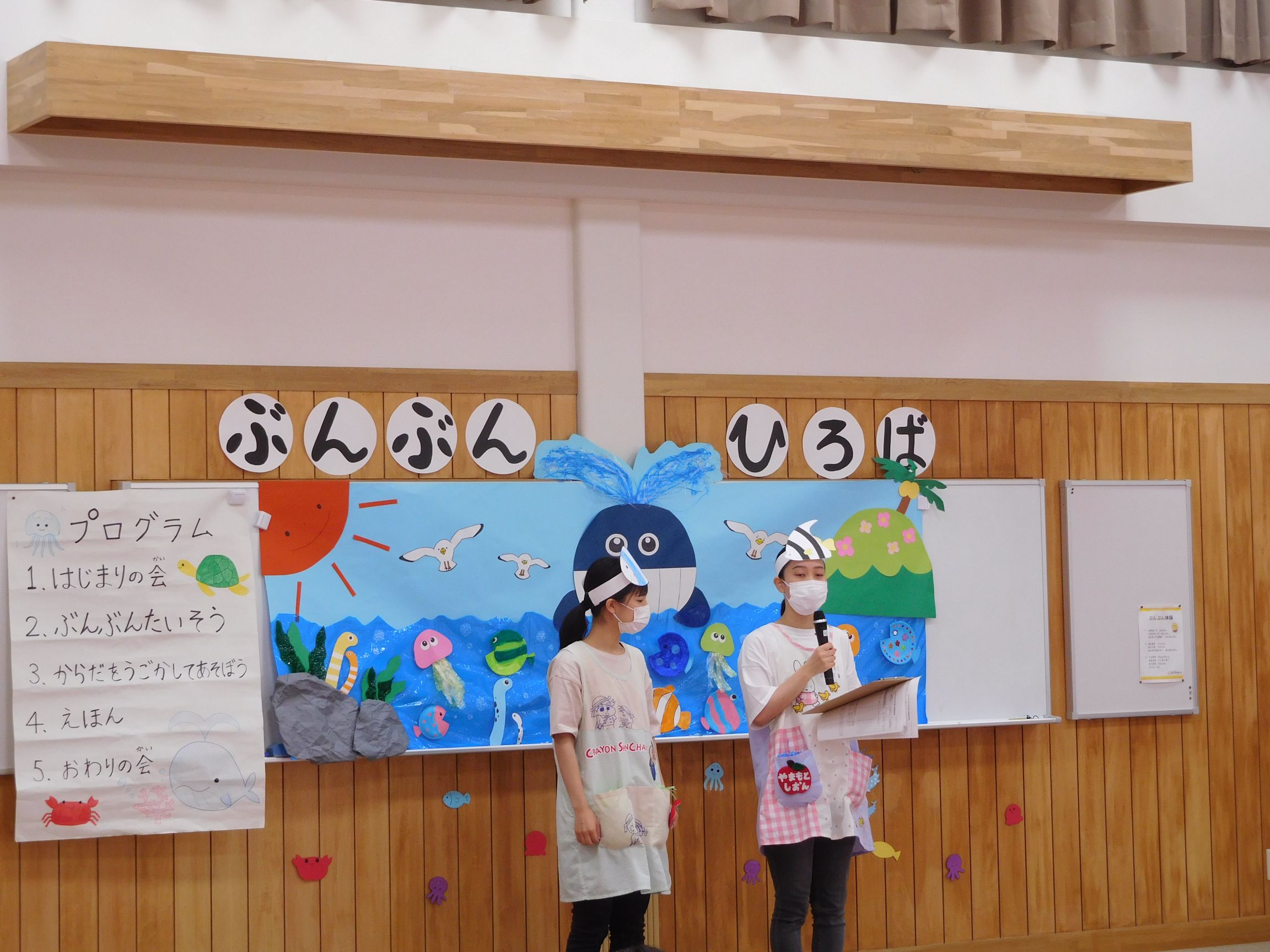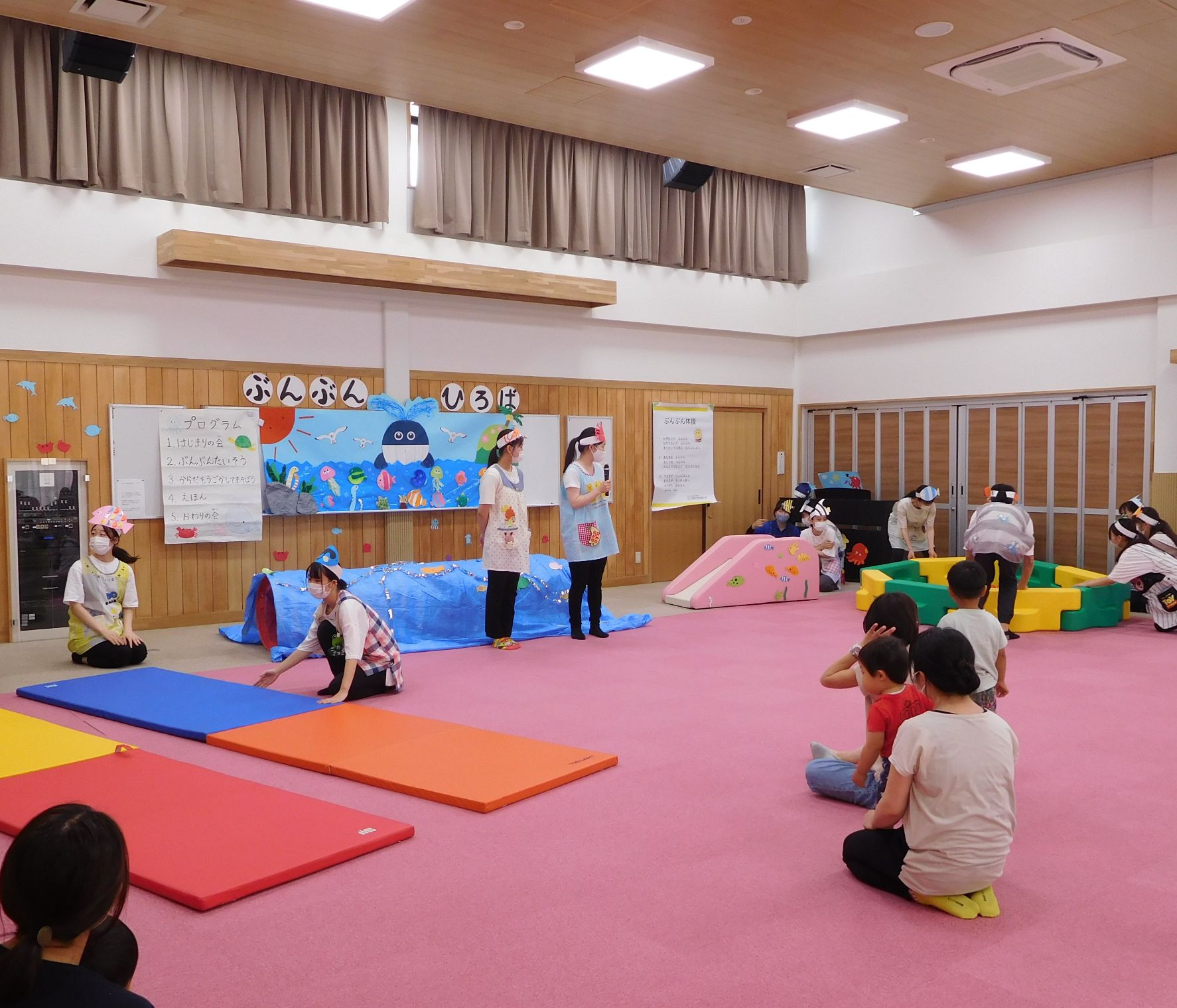 今回のぶんぶんひろばのプログラムは「はじまりの会」「ぶんぶんたいそう」「からだをうごかしてあそぼう」「えほん」「おわりの会」です。「からだをうごかしてあそぼう」では、「海の遠足」と題してボールプールや滑り台、トンネル、マットを準備し、子どもたちには好きな場所に行って、身体を動かして遊んでもらいました。