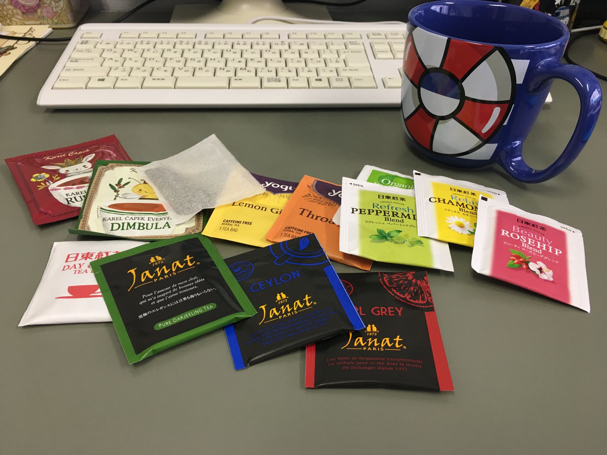 紅茶が好きです(他のお茶も好きです)!家では妊娠・出産・育児の妻に合わせカフェインレス・カフェインフリーのものばかり飲んでいるのでちょっと単調な感じになってしまいました。下の写真は研究室用に持ってきているティーバッグたち!お手軽ですが、良い香りを楽しめます!もっと色々なフレーバーを楽しみたいです!