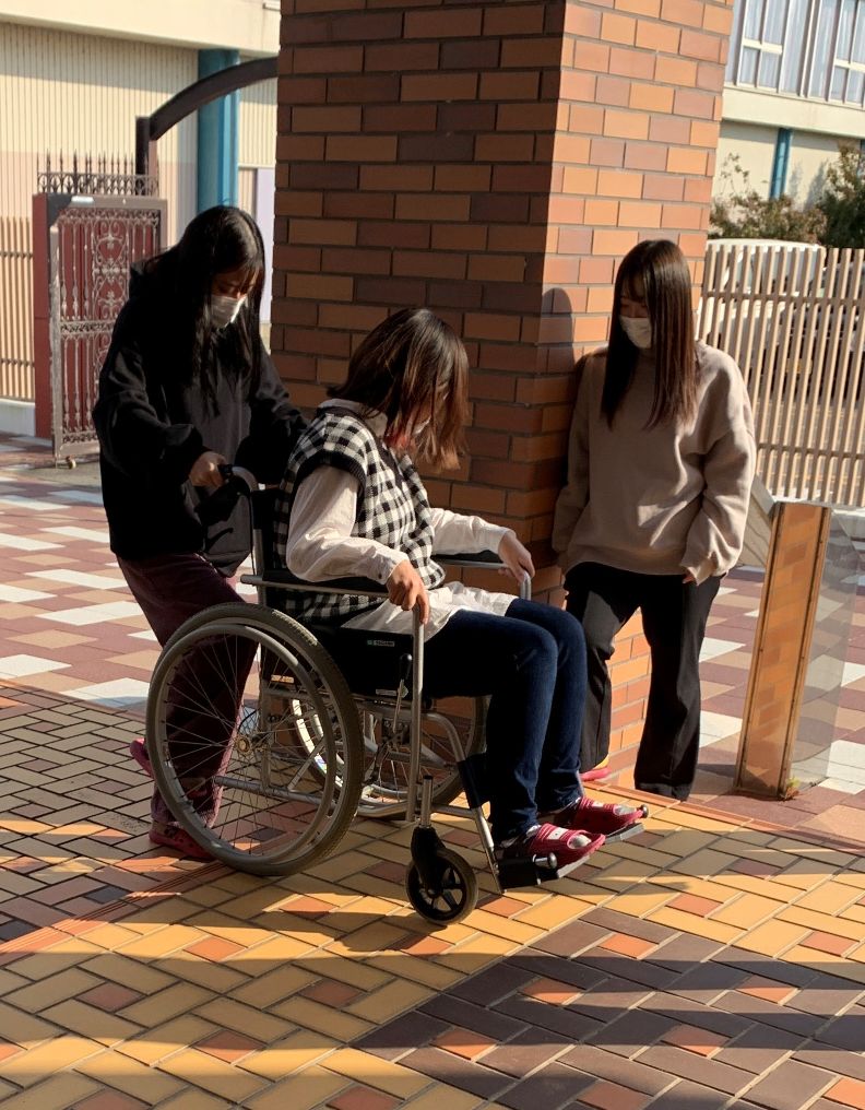 施設実習では、障がいのある方の施設(指定障害福祉サービス事業所など)で、実習をさせいただいています。そのため、少しでも介助ができるように、施設実習指導の授業の中で、車いす演習を行っています。