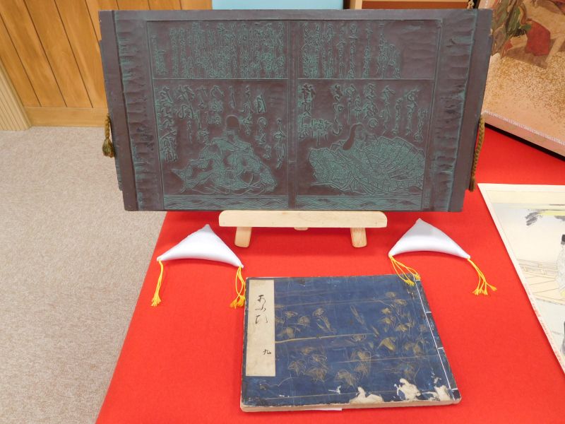 休憩時間には、池田先生架蔵の『源氏物語』の貴重な江戸時代の古典籍や目玉の浮世絵、土佐派の肉筆画、明治時代の版木などの展示があり、参加者の方々の目を楽しませていました。