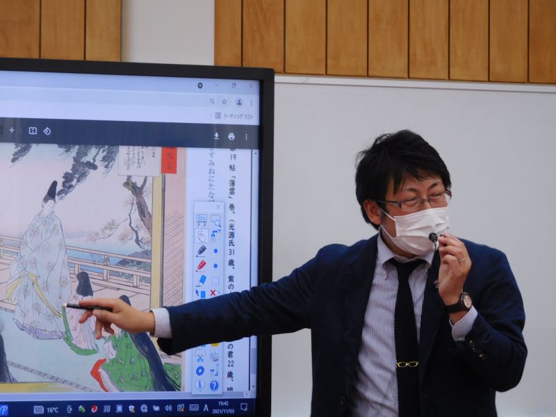 国文学科の池田大輔先生が、11月3日(水)の文化の日にあわせて、本学翠湖館あすなろホールで「浮世絵とともに楽しむ『源氏物語』の世界」の講座を行いました。