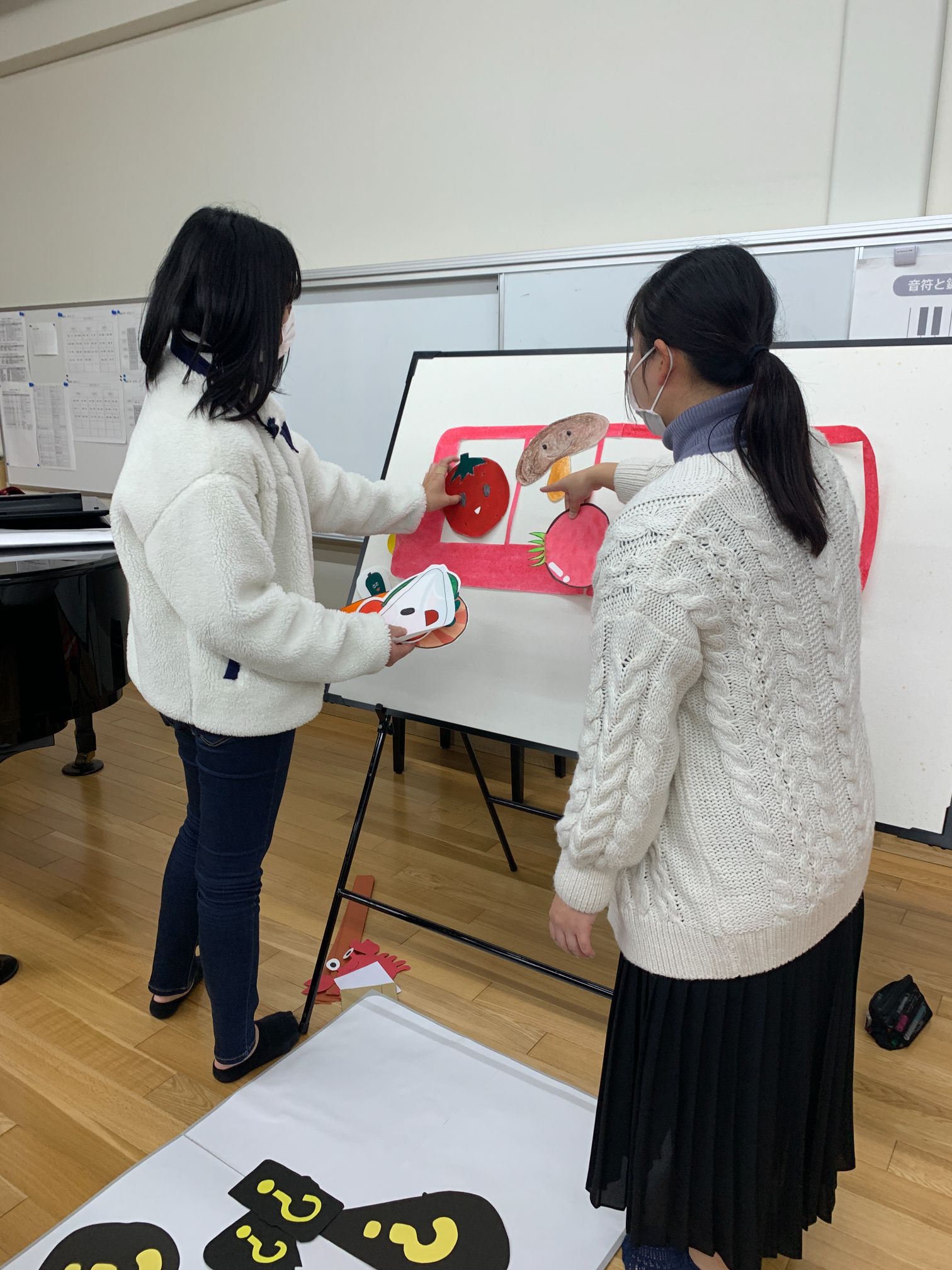 子ども学科2年生は、12月4日(土)の学修成果発表会に向けて、準備をしています。今年度の学修成果発表会は「食育」をテーマに3グループに分かれて、「ペープサート」「参加型クイズ」「音楽劇」を行います。
