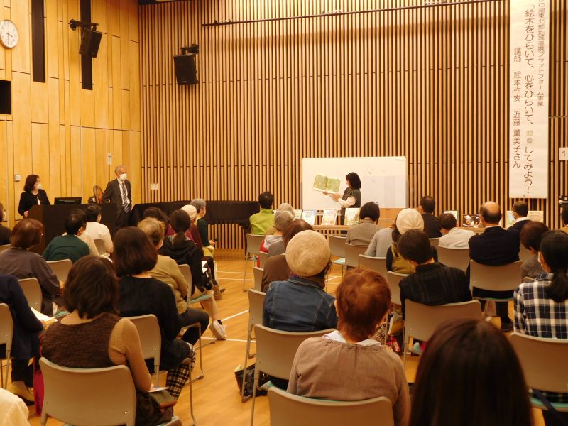 滋賀県在住の絵本作家 近藤薫美子さんの講演会を、10月30日(土)、長浜市のさざなみタウン「ながはま文化福祉プラザ長浜まちづくりセンター多目的ホール」で開催しました。