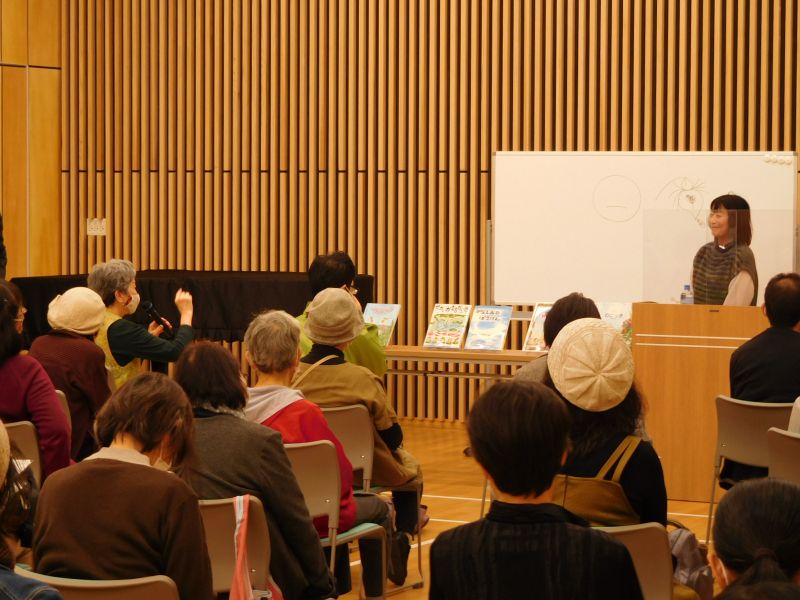 今回の講演では、『のにっき-野日記-』で一匹のイタチが死んでからその形がなくなる様を描くのに、どのように小動物の観察をしたかということをはじめ、最新作の『かなしみのぼうけん』に至る様々な作品について、何を思い、どのように創られてきたかということを絵本で示しながら語ってくださいました。絵本同様、厳しく深い内容でありながら、楽しくユーモアにあふれたお話でした。
