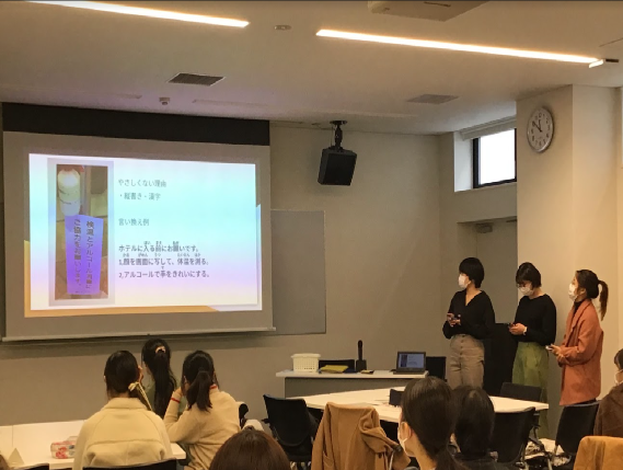 そして、勉強会で学んだことを活かし、それぞれのグループに分かれて「やさしい日本語」プロジェクトの協力施設を訪問し、施設内の表示を「やさしい日本語」に変換する活動をしました。