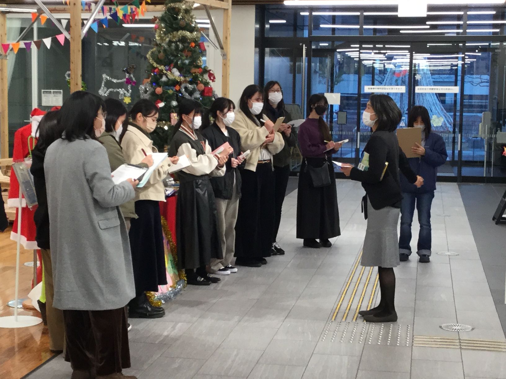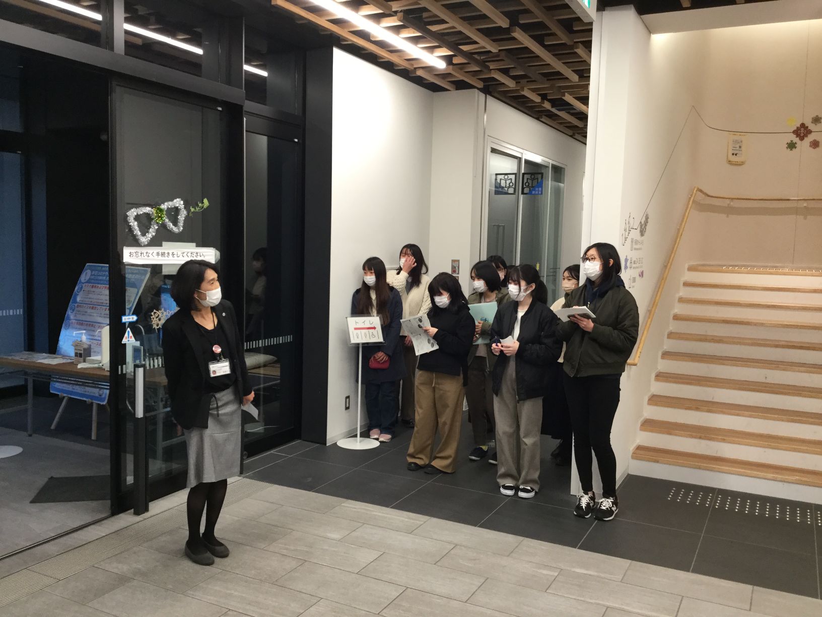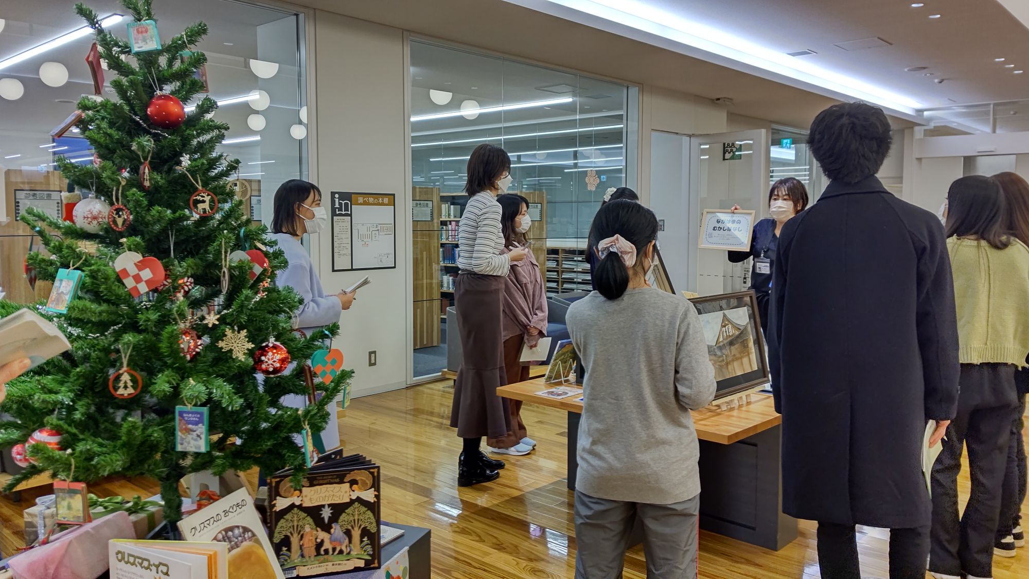 12月9日(木)国文学科2年生で司書課程を履修中の23名と教員3名で長浜市立長浜図書館を見学させていただきました。幸い12月にしては温かい穏やかな日で、全員が集合時間までに図書館前に集まり、時間通りに始まりました。