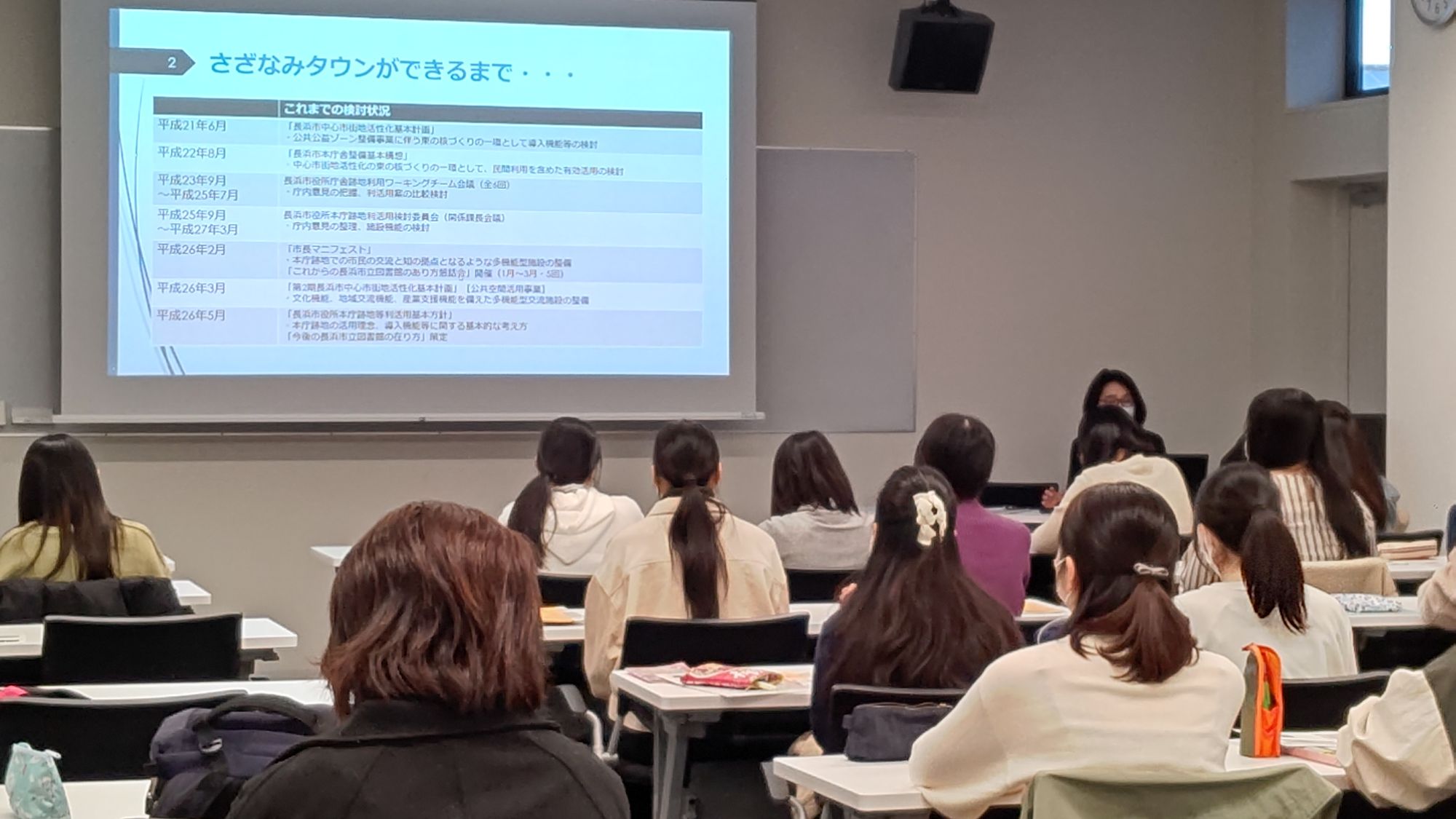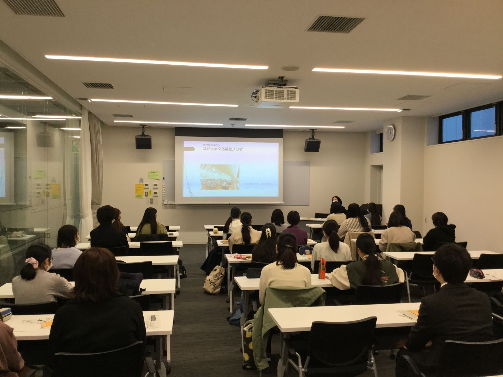 まず、長浜市立図書館館長の下司満里子さんから、約30分、現在の長浜図書館ができるまで、また、どのように運営しているかについて、パワーポイントを使ってご説明いただきました。その中には、図書館の設計段階で行われた、中高生など若者にも魅力的な図書館にするためのワークショップに参加しているインターン実習中の本学の先輩たちの姿もありました。