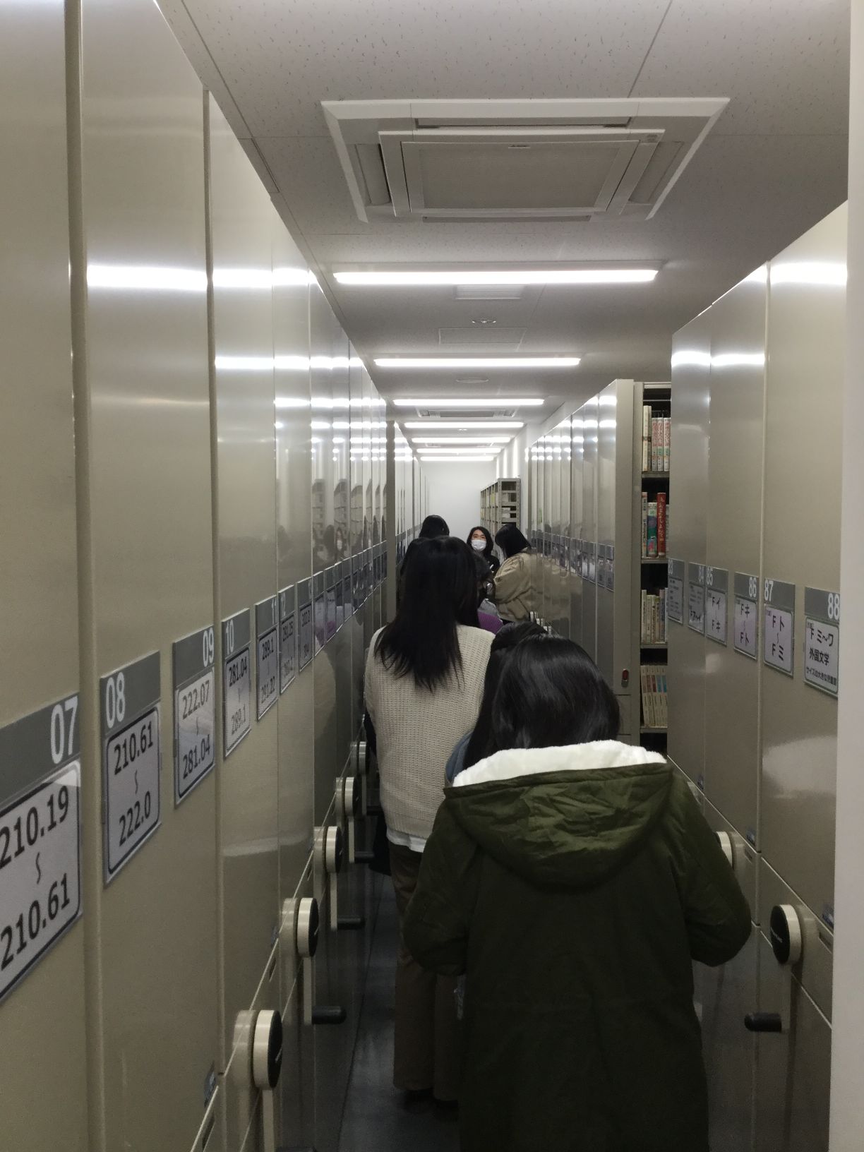 そのあと、2グループに分かれ、館長の下司さんと、この見学の実施にご尽力いただいた司書の松山ゆかりさん(本学の卒業生です)のご説明で館内をご案内いただきました。