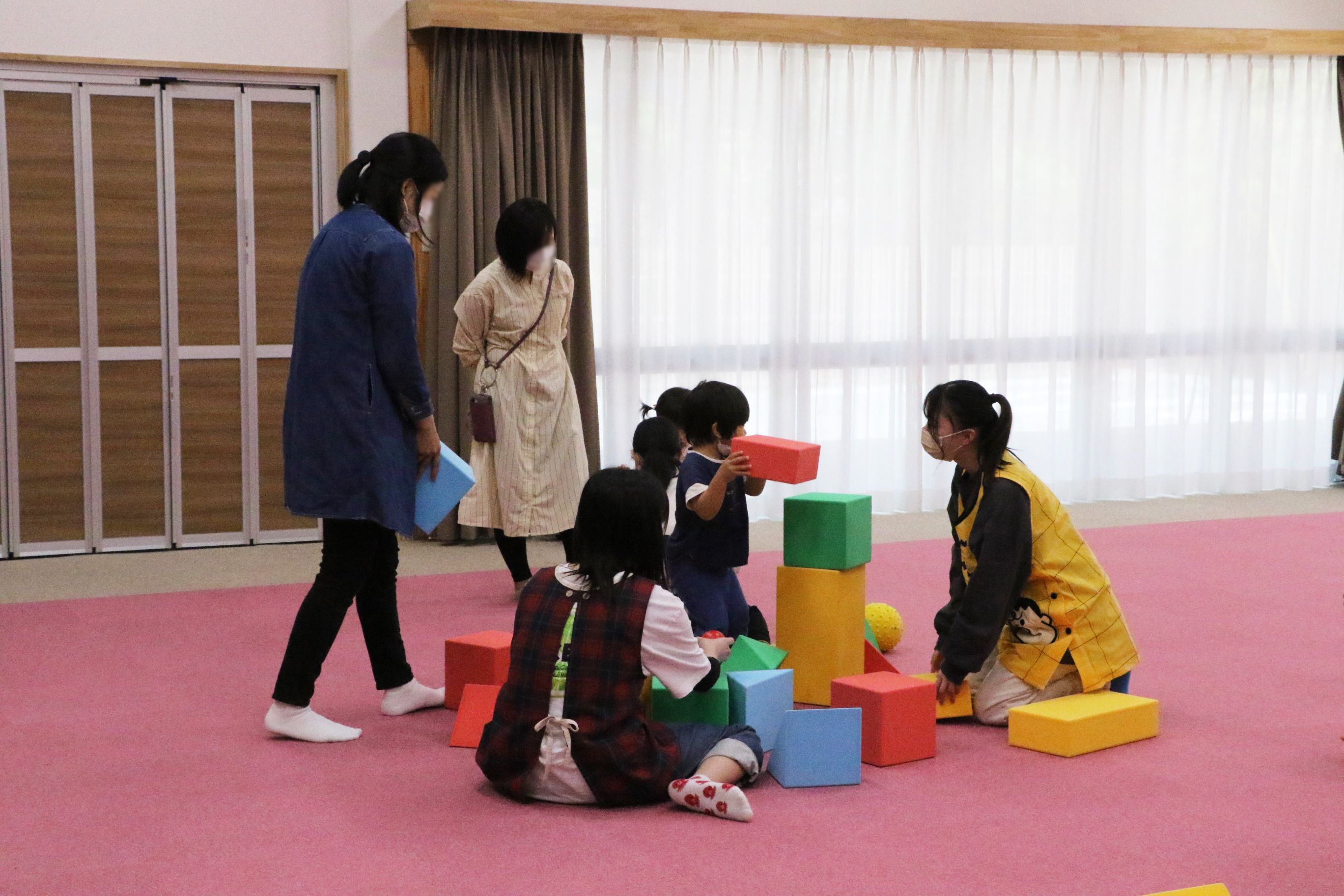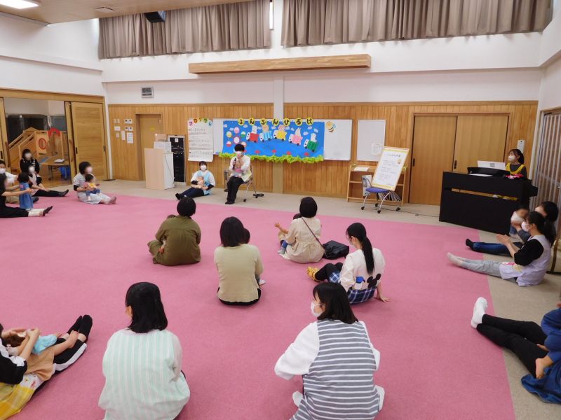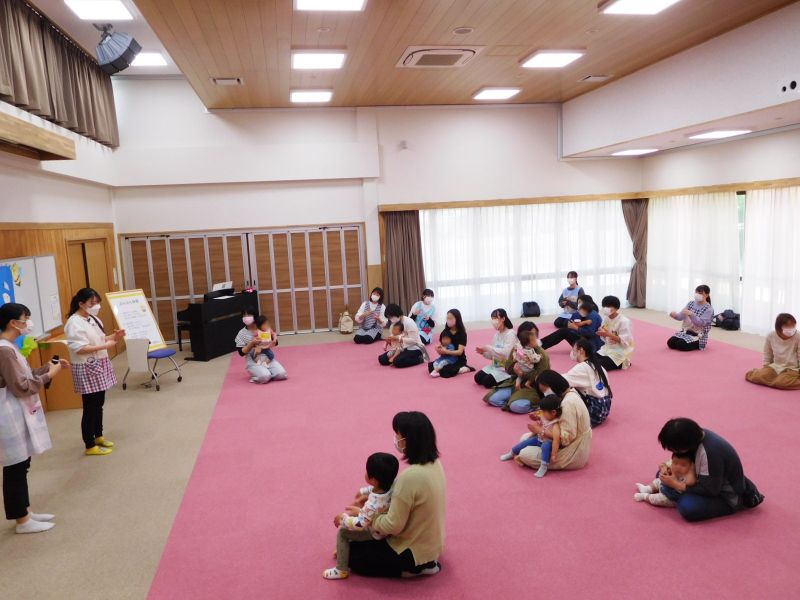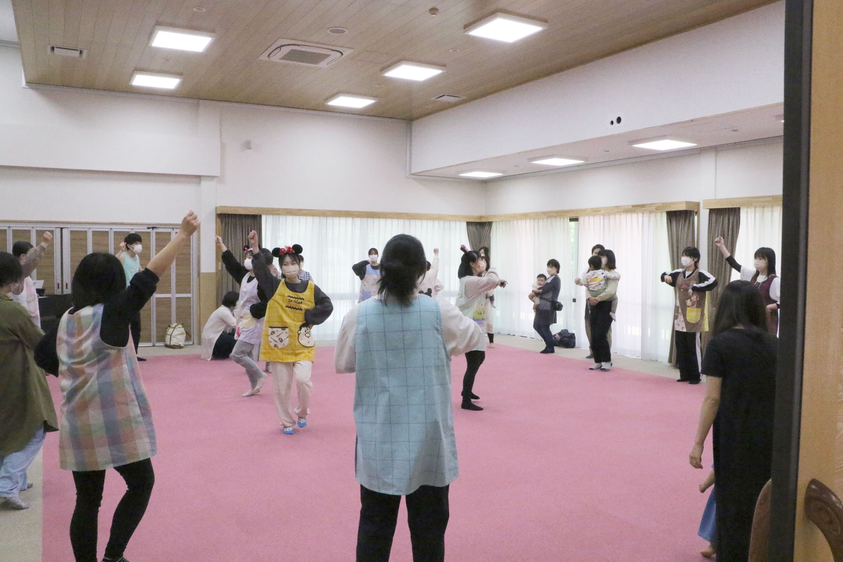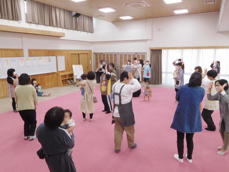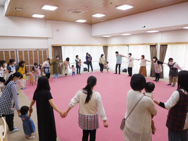 「親子でメリーゴーランド」の歌に合わせて、親子で手をつないで「ぐるぐる~!」。次に周りのお友達や学生と輪になって「ぐるぐる~!」、そして最後には全員でしっかり手をつなぎ大きなメリーゴーランドになって「ぐるぐる~!」と楽しみました。