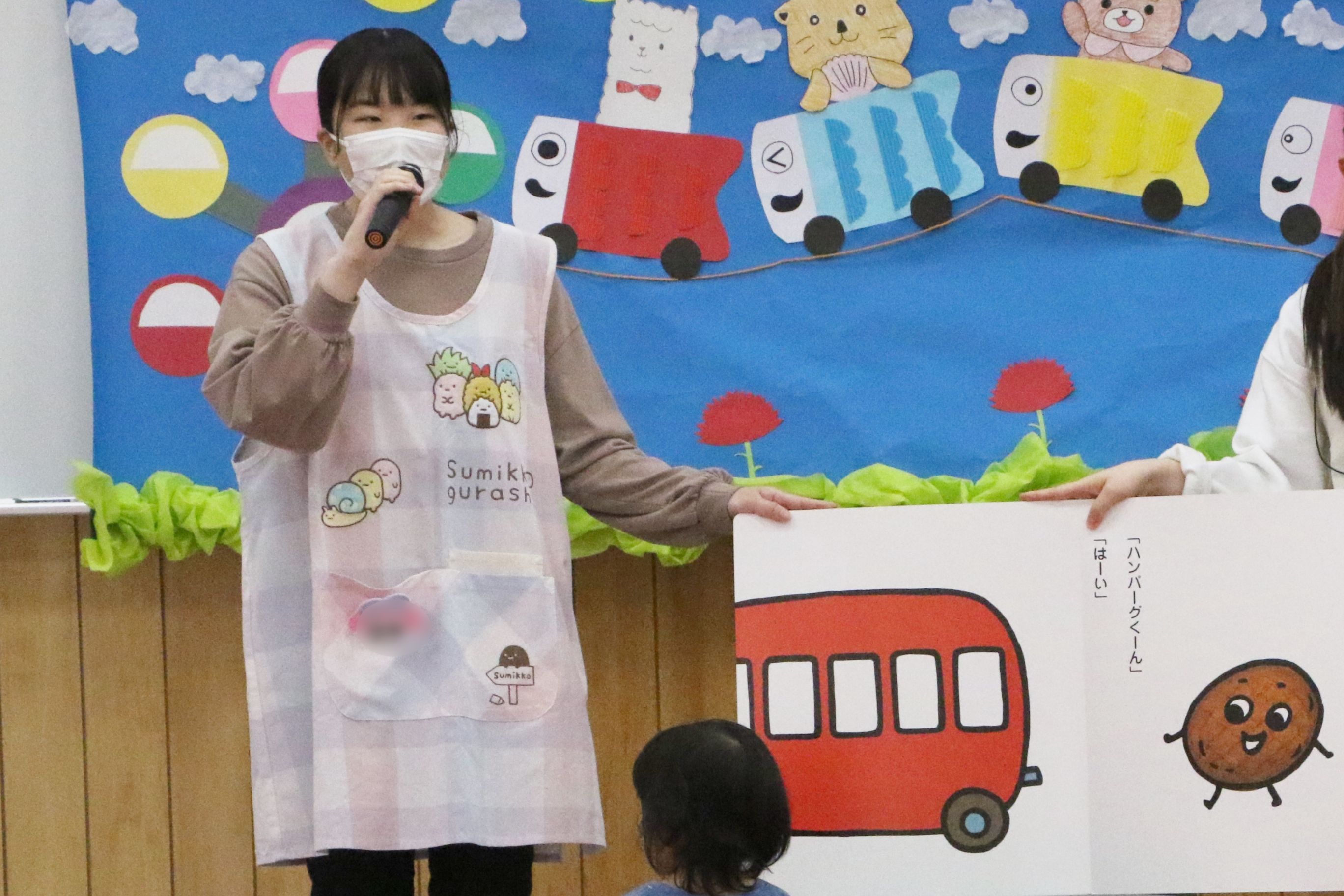 「いっぱい動いて暑くなってきたね。アイスクリーム屋さんを呼ぼう!」。アイス屋さんの学生が登場し、手遊び「ペロペロアイス」でいろんな味のアイスをペロペロ食べました。