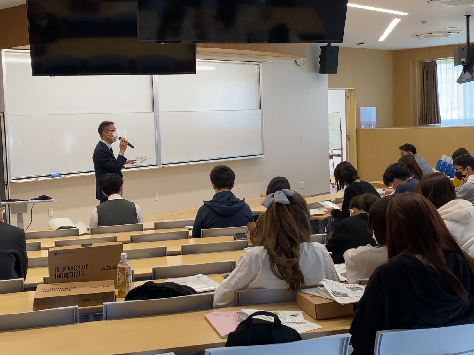 少し前のできごとではありますが、本学に今年度入学した新入生を対象に、長浜警察署様、長浜市役所様にご協力をいただき、ご講演をいただきましたので、その様子をご紹介いたします。