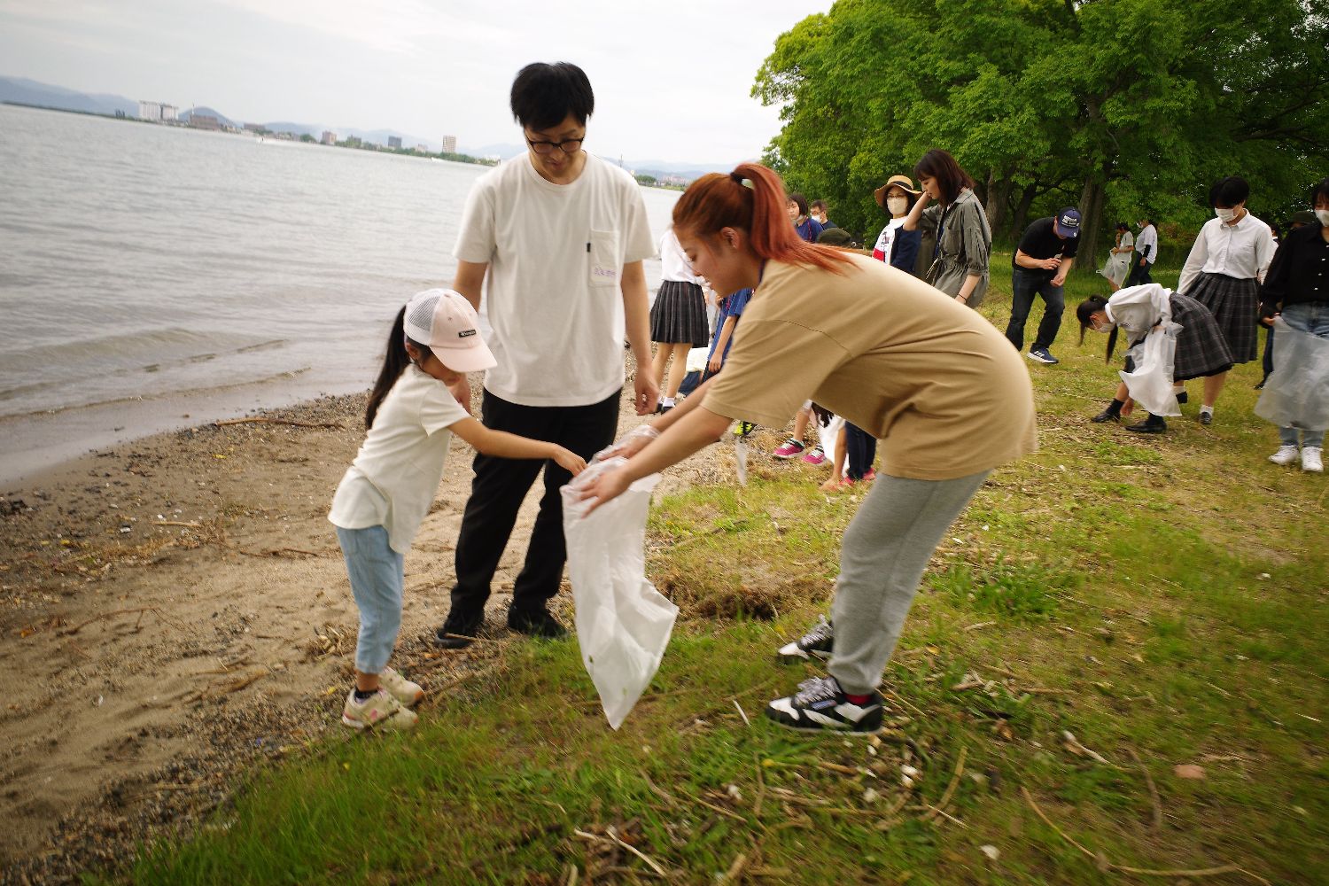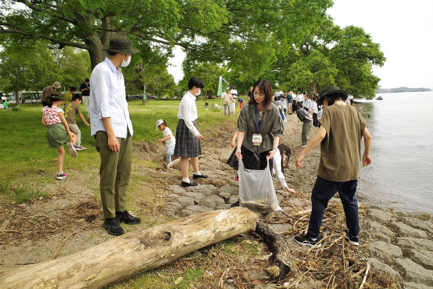 はじめに、グループごとに琵琶湖畔のゴミを拾います。一見キレイに見えてもいろいろなゴミが落ちていますので、短時間でたくさんのゴミを拾いました。