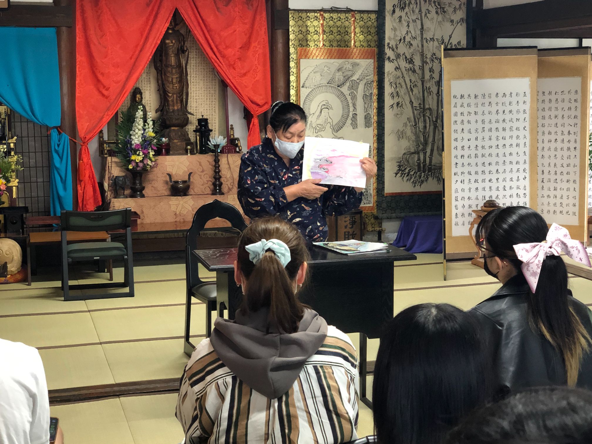 語りを聞いた後、住職からお寺の歴史や特徴等についてお話しをいただきました。全長寺には貴重な資料や仏さまが、たくさん保存されています。