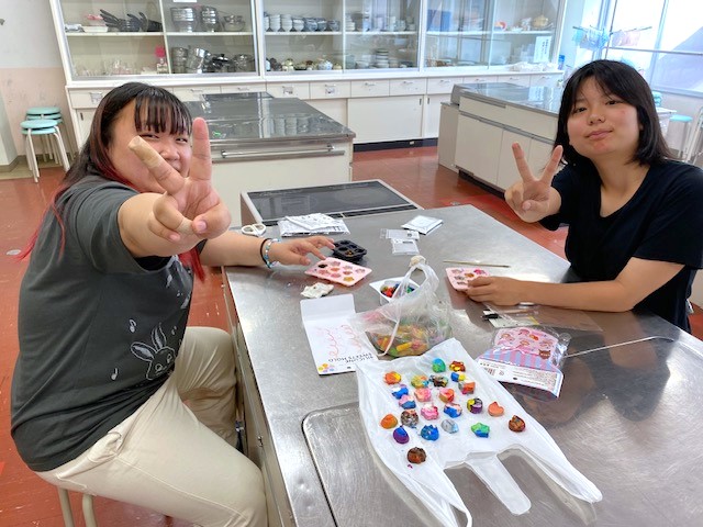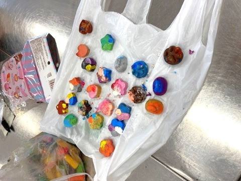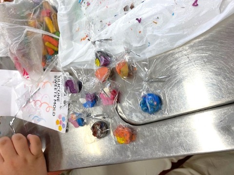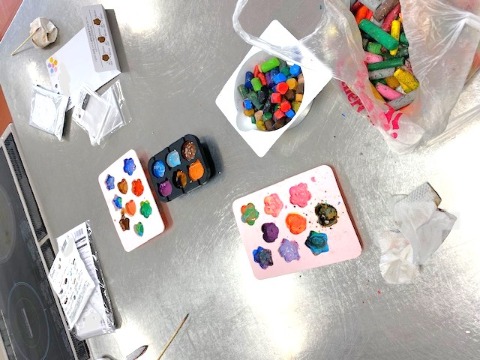 加熱して溶けたクレヨンを混ぜて、色とりどりのクレヨンができました。完全に混ぜて単色になっているものから、少しだけ混ぜたマーブル様のクレヨン。形もお花やお星さまの形と様々で、とてもかわいらしい仕上がりです。まだ試作のため、次はこんな風に…と本番にむけて考えながら取り組んでいました。また最後には、先生方に配ろう!とラッピングをしていました。