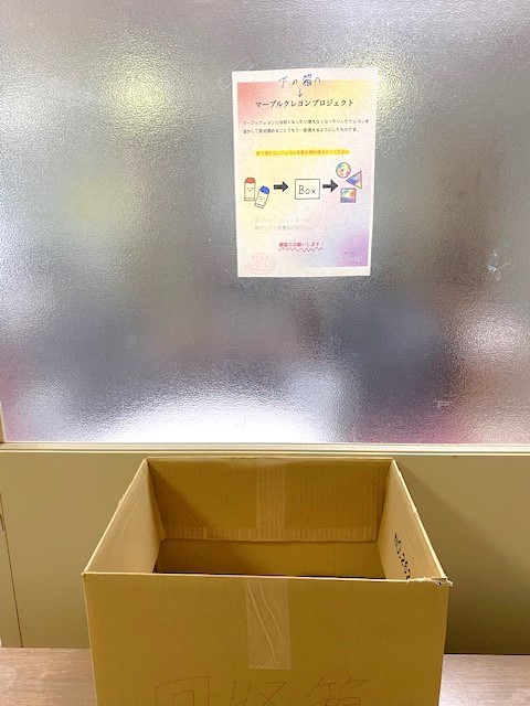 「マーブルクレヨンプロジェクト」と書かれています。このマーブルクレヨンとは、短くなったり使えなく・使わなくなったりしたクレヨンを溶かして混ぜ固めることでもう一度使えるようにするものだそうです。学生らが、この取り組みをはじめるまで知りませんでしたので、「そんなことができるんだなぁ」と一人感心していました。