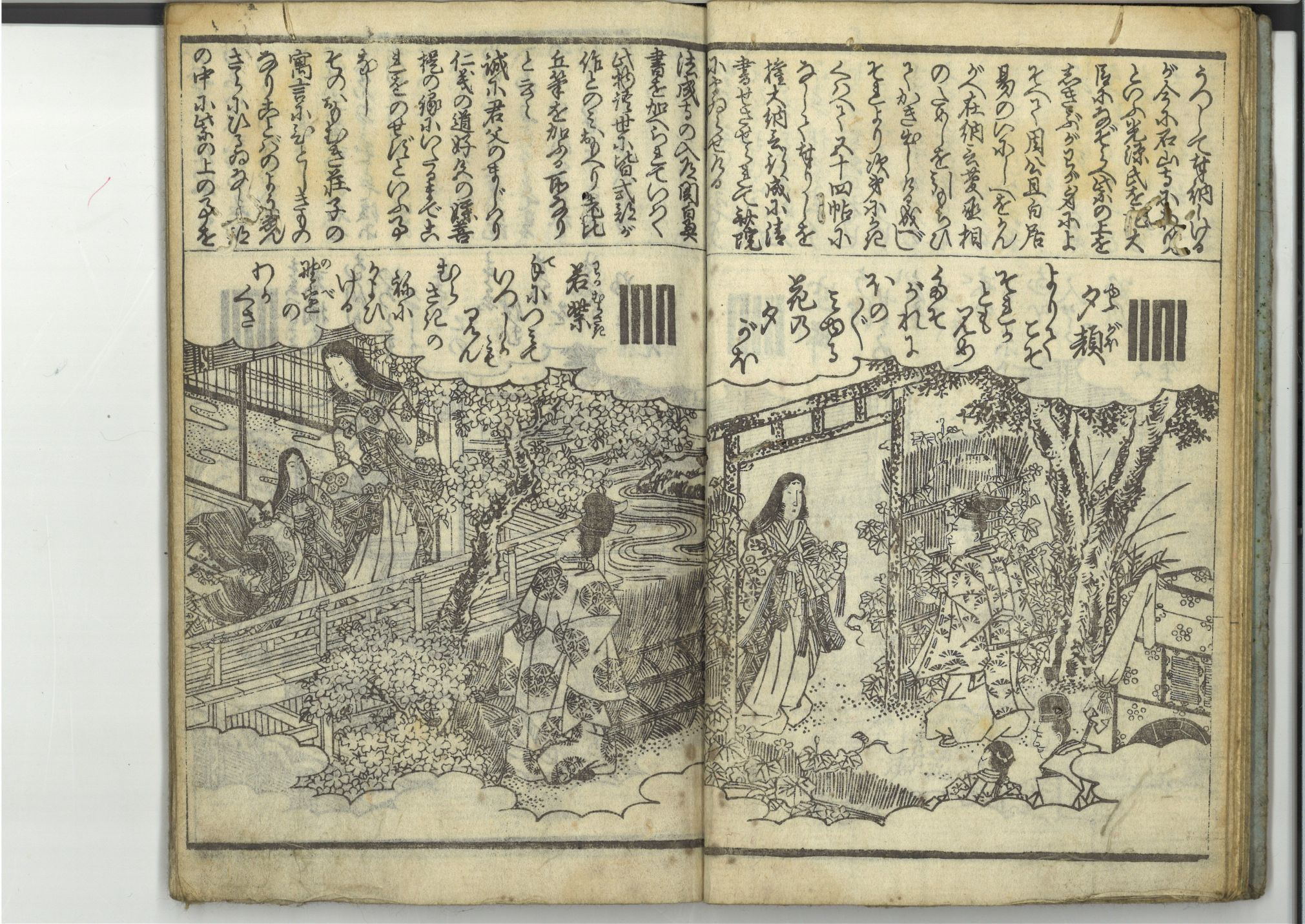使用しているテキストは、江戸時代後期に刊行された『源氏物語絵尽大意抄』(池田が現物を3冊所蔵)というもので、これは、数多くある『源氏物語』のテキストの中でも、半丁(和本のページの数え方)に、各1巻の場面絵と和歌を載せるという江戸時代においては画期的な梗概書でした。それを、186年後の読者として読み解いています。