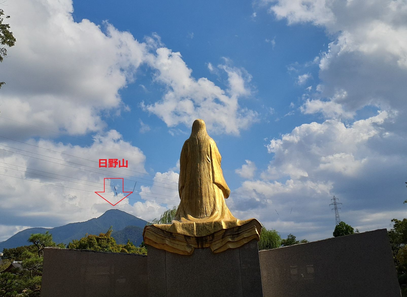お腹を満たした後は、「紫式部公園」へ。ここは、貴族の邸を模して作られ、大きな池や中島、遣水などと釣り殿があります。そして、黄金に輝く紫式部像。その見つめる先には「日野山」(ゼミ生も式部と同じ日野山を見つめてみました(笑))