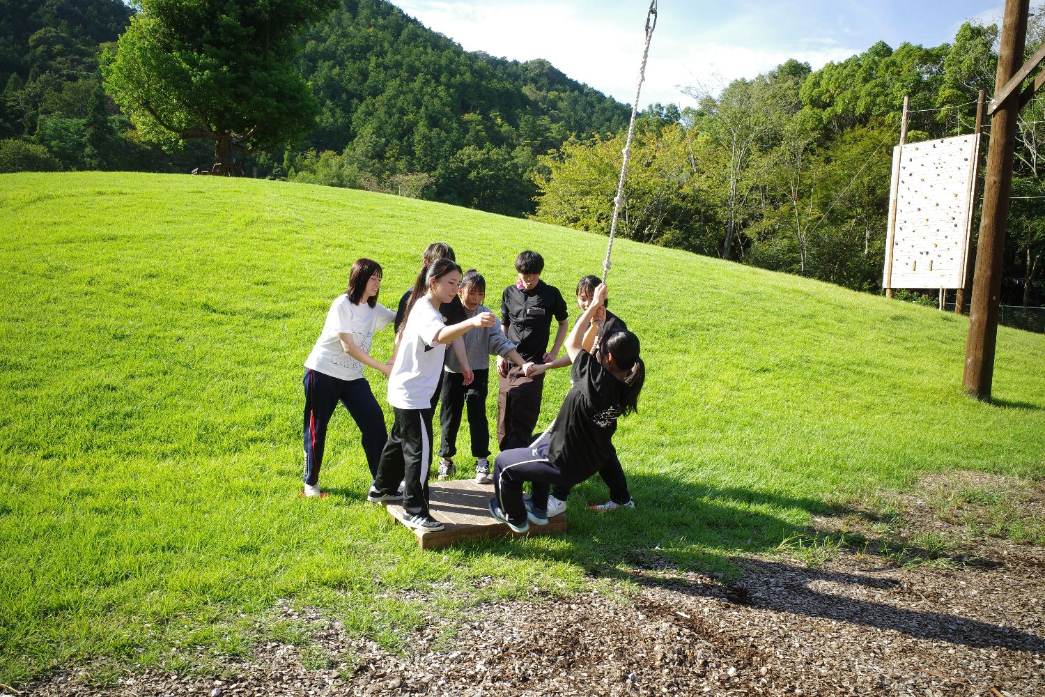 次に、野外でのPAです。まずは、「ハイエレメント」に挑戦です。仲間の命を、みんなが1本のロープで支えるので、お互いの信頼関係が必要です。