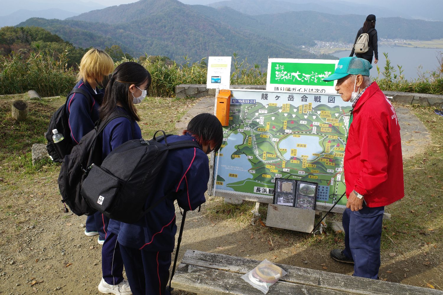 食事の後は、山頂の調査を行いました。奥びわ湖観光ボランティア協会の方が、観光ガイドをされていたので、インタビューさせていただきました。興味深いお話を伺うことができました。