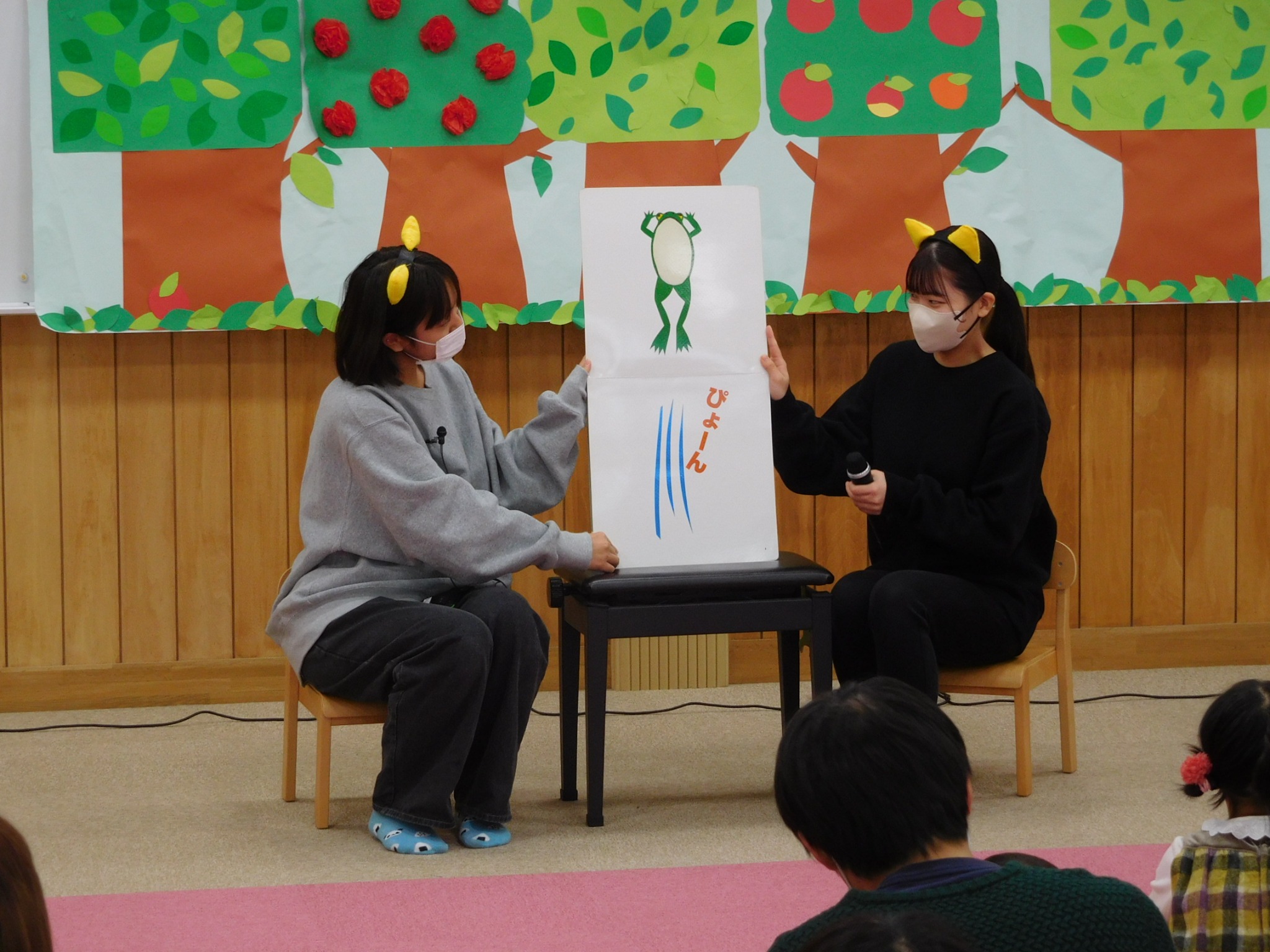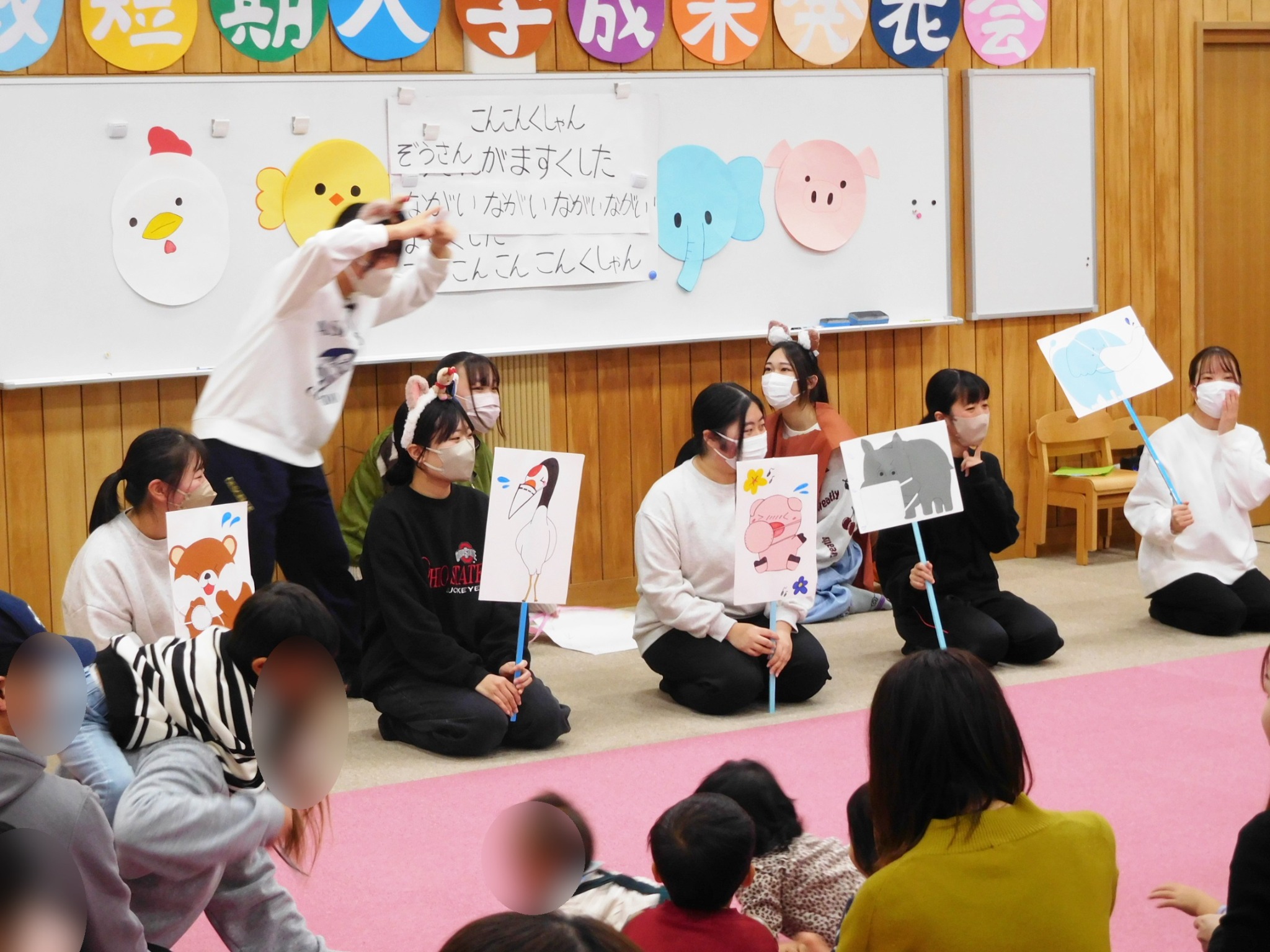 「オープニング」「わらべ歌・大型絵本」「劇」「合奏」「エンディング」という構成で行いました。それぞれが衣装を身に付けたり、パペットを使ったりして楽しい表現となるように工夫しました。また合奏では、トーンチャイムやベルなどの演奏を行いました。