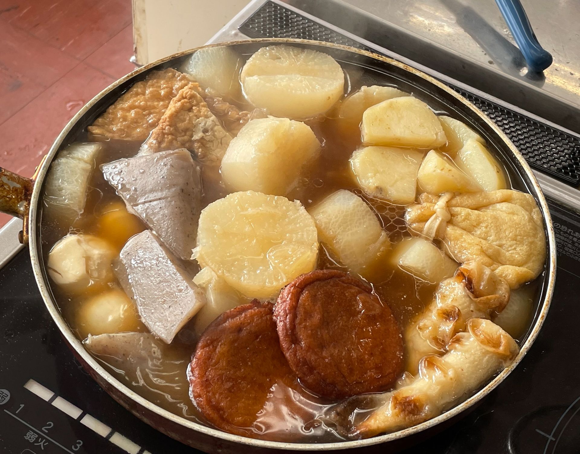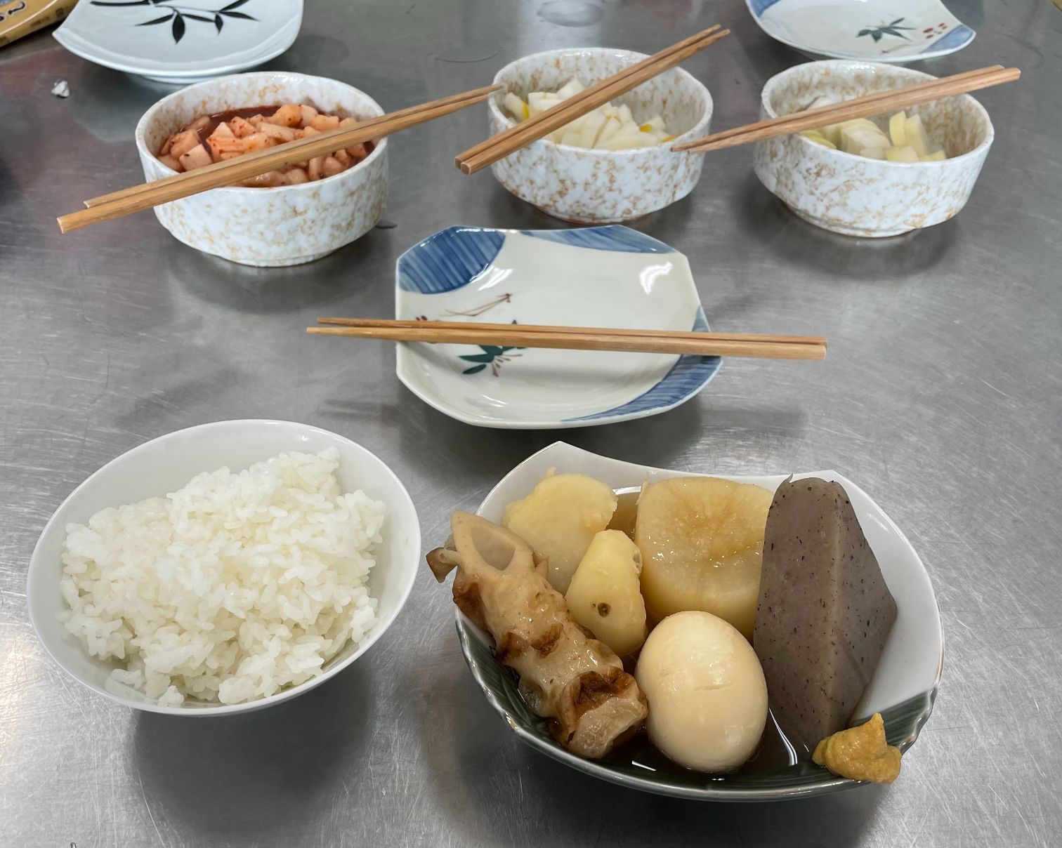 調理の経験が豊富で 材料など色々と用意し、リーダーとして頑張ってくれた A さんのおかげで準備から順調に進みました。実際のところ、昆布で出汁を取り、様々な調味料で味付けをして美味しいおでん が出来上がりました。