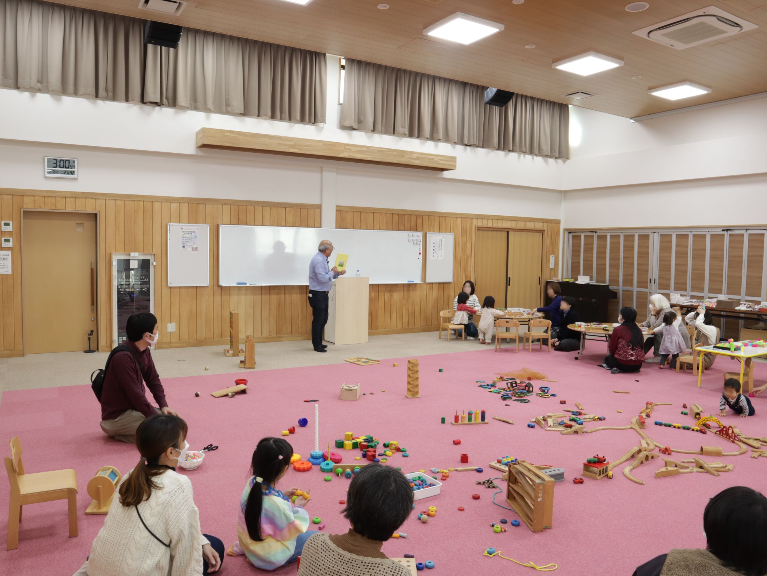 当日は、大人も子どもも絨毯敷の会場いっぱいに広げられた様々なおもちゃで遊びながら、岩城さんの絵本と子育てのお話を聞き、また、個人的に子育てやおもちゃの与え方などについて聞くこともできるという、にぎやかな講座となりました。