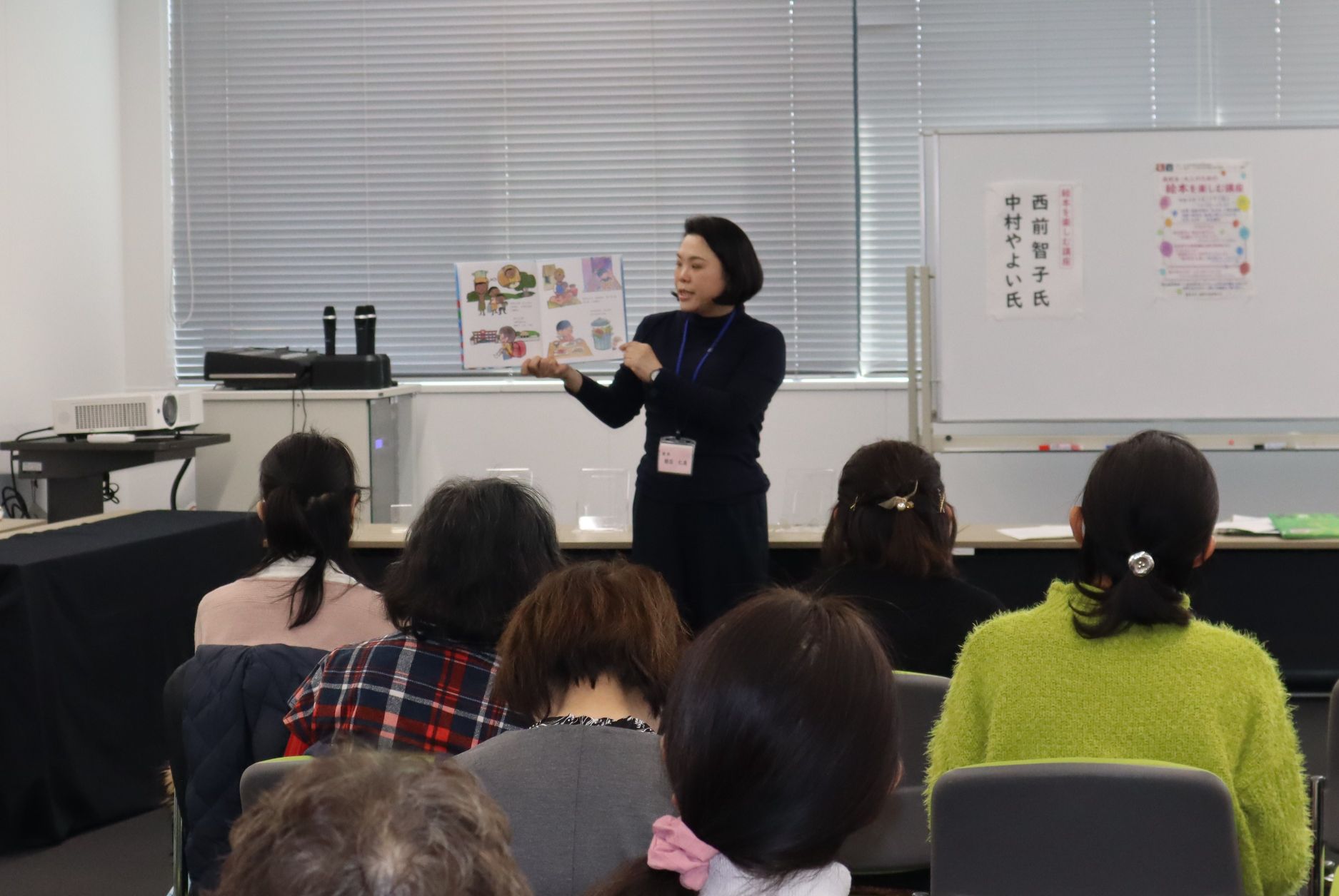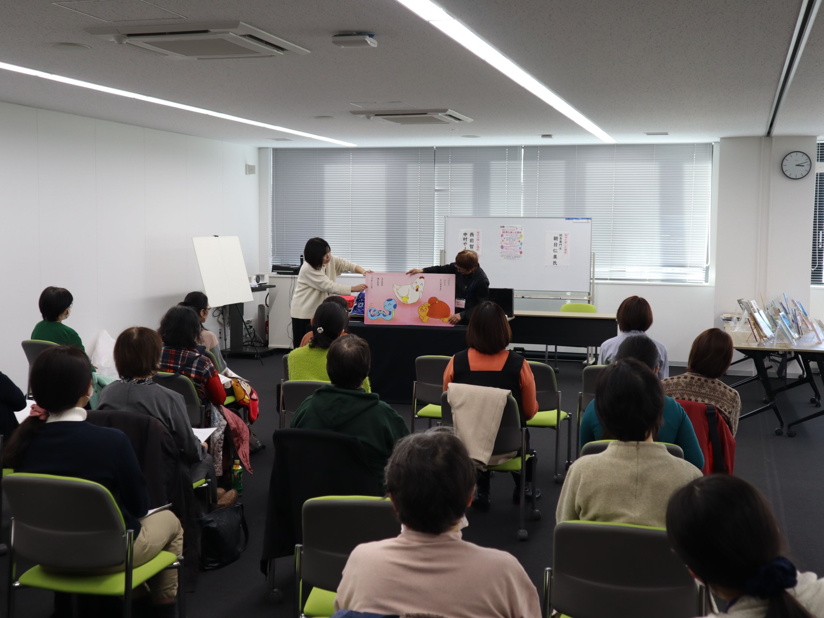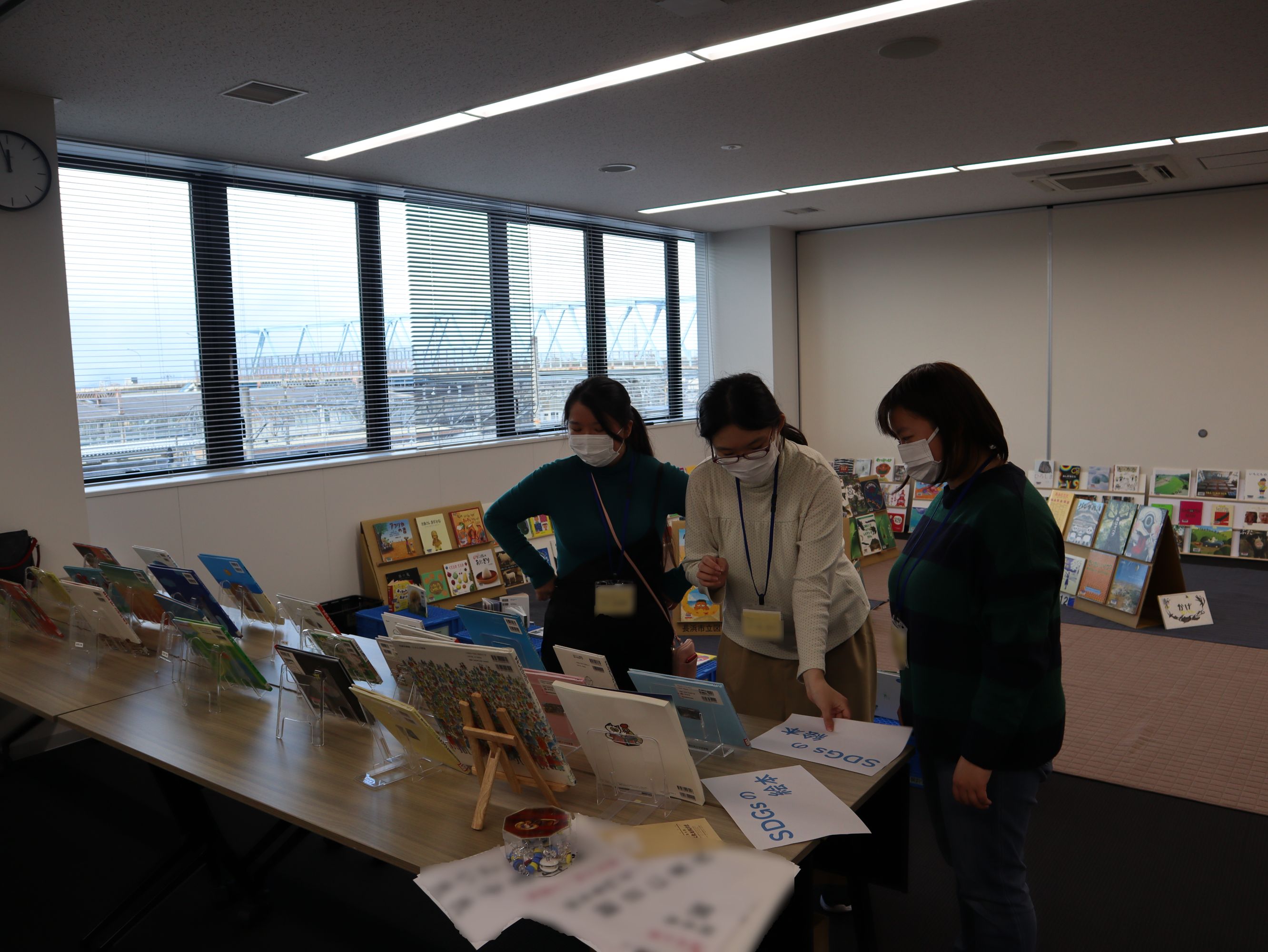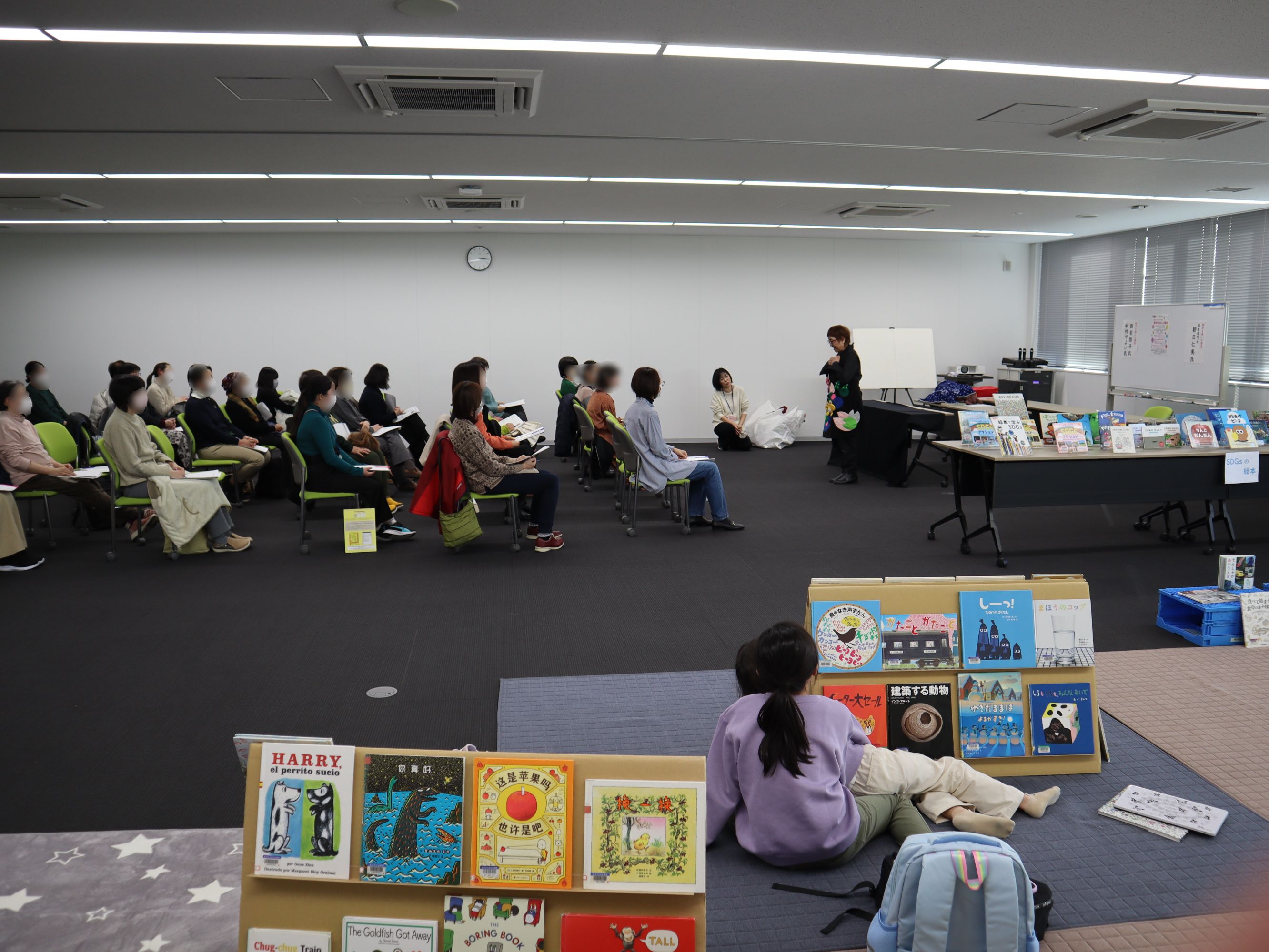 プログラムは、絵本専門士の朝日仁美さんによるお話とSDGsをテーマとしたブックトーク、長浜市の園・学校を中心に読書ボランティアをされている西前智子さん、中村やよいさんによる「おはなし会」、そして、200冊以上の絵本を並べた「絵の本ひろば」の開催でした。