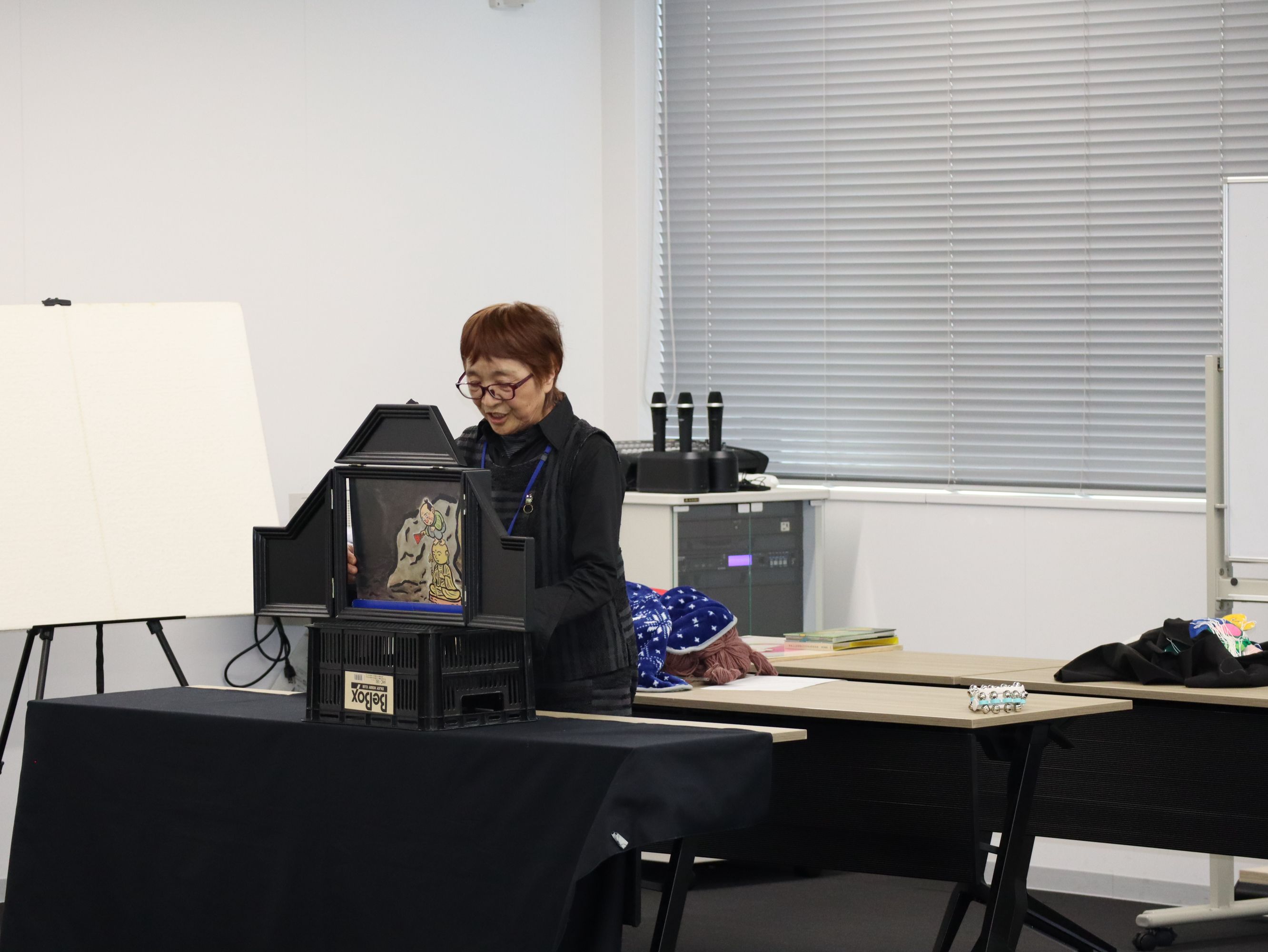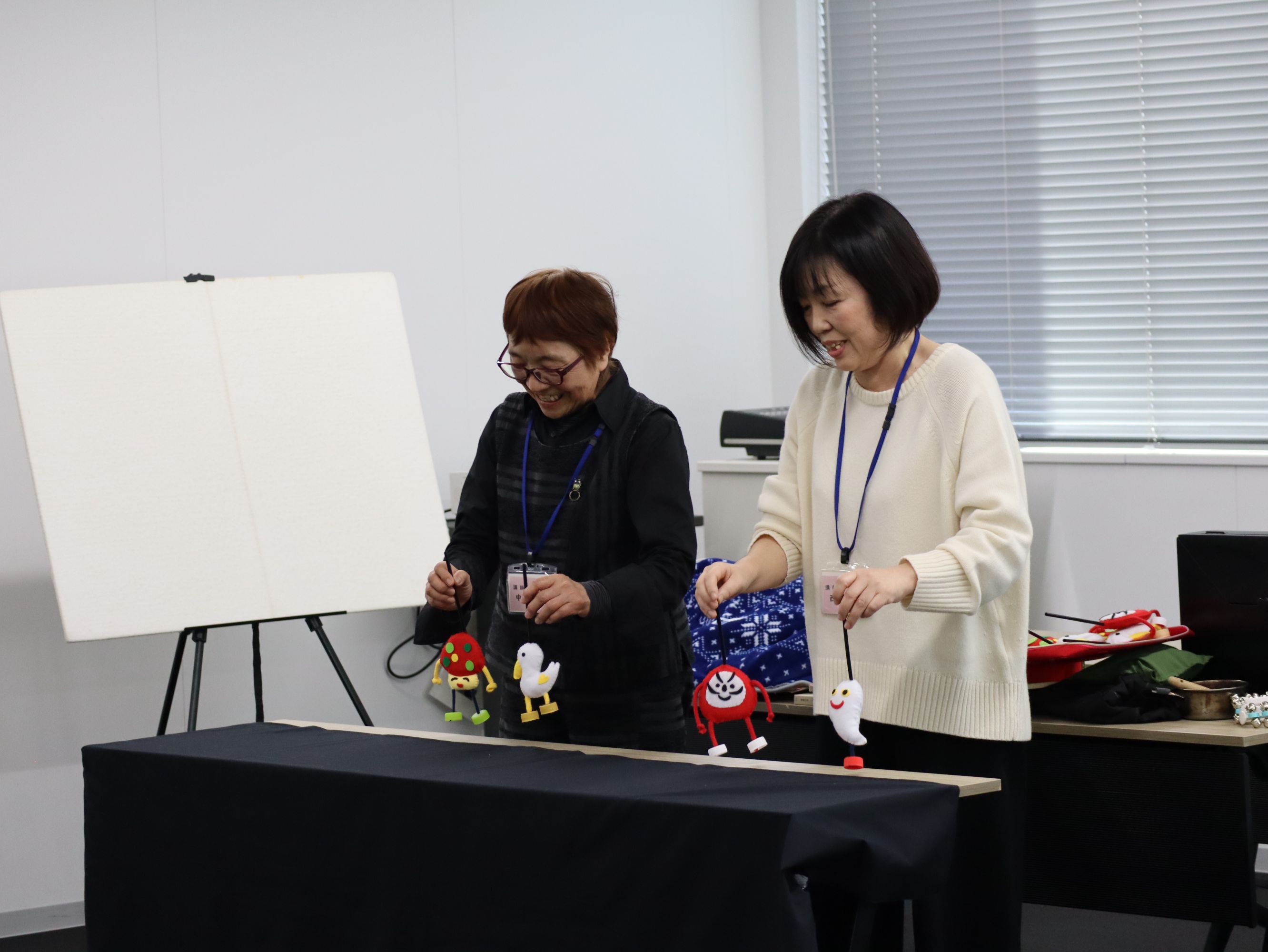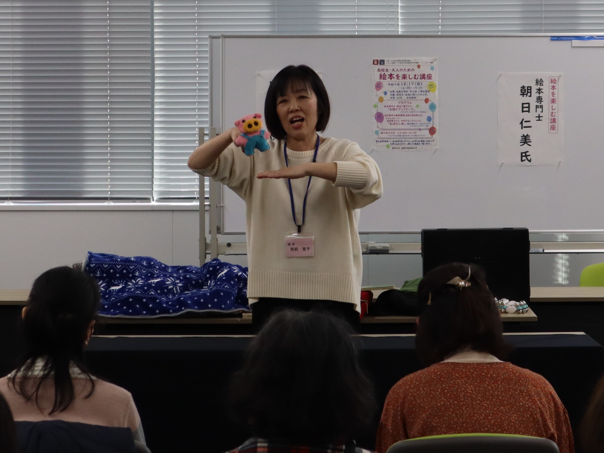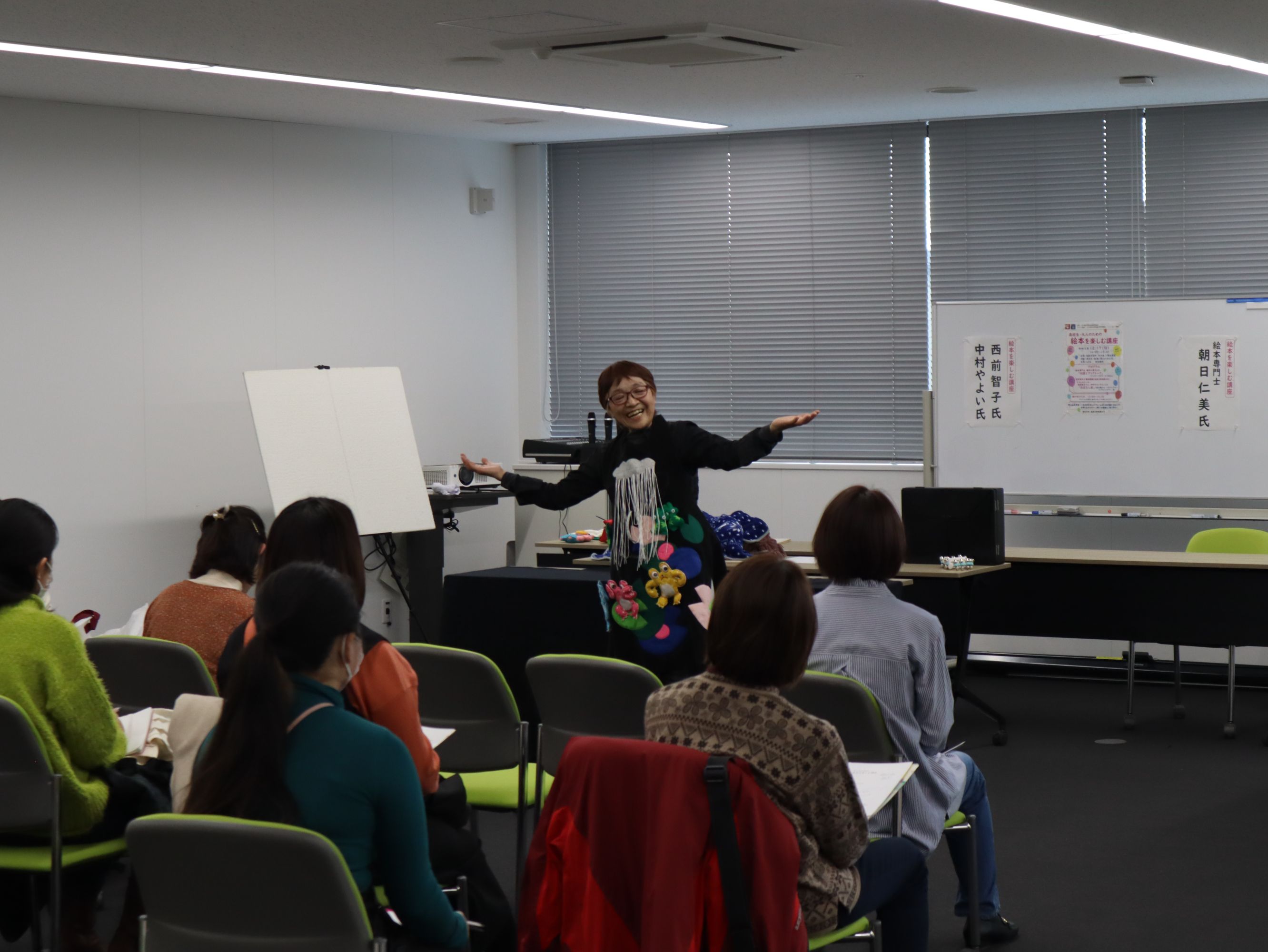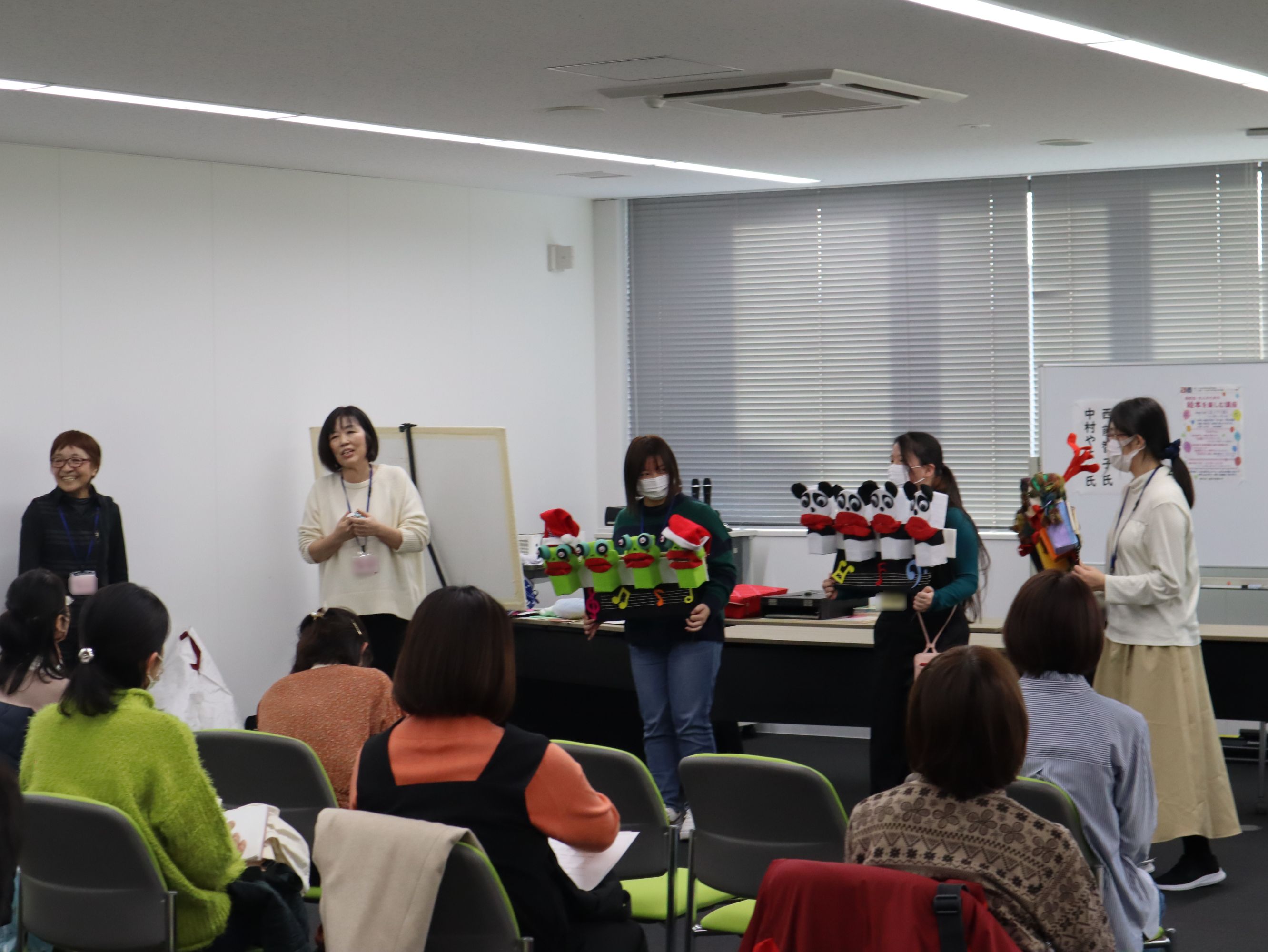 本学の「認定絵本士養成講座」の授業にゲストスピーカーとして来てくださっている、西前智子さんと中村やよいさんには、読み聞かせ、紙芝居、パネルシアター、エプロンシアターそのほか様々なプログラムをしていただき、とても楽しい時間を過ごすことができました。プログラムの最後には、本学の学生も参加させていただきました。