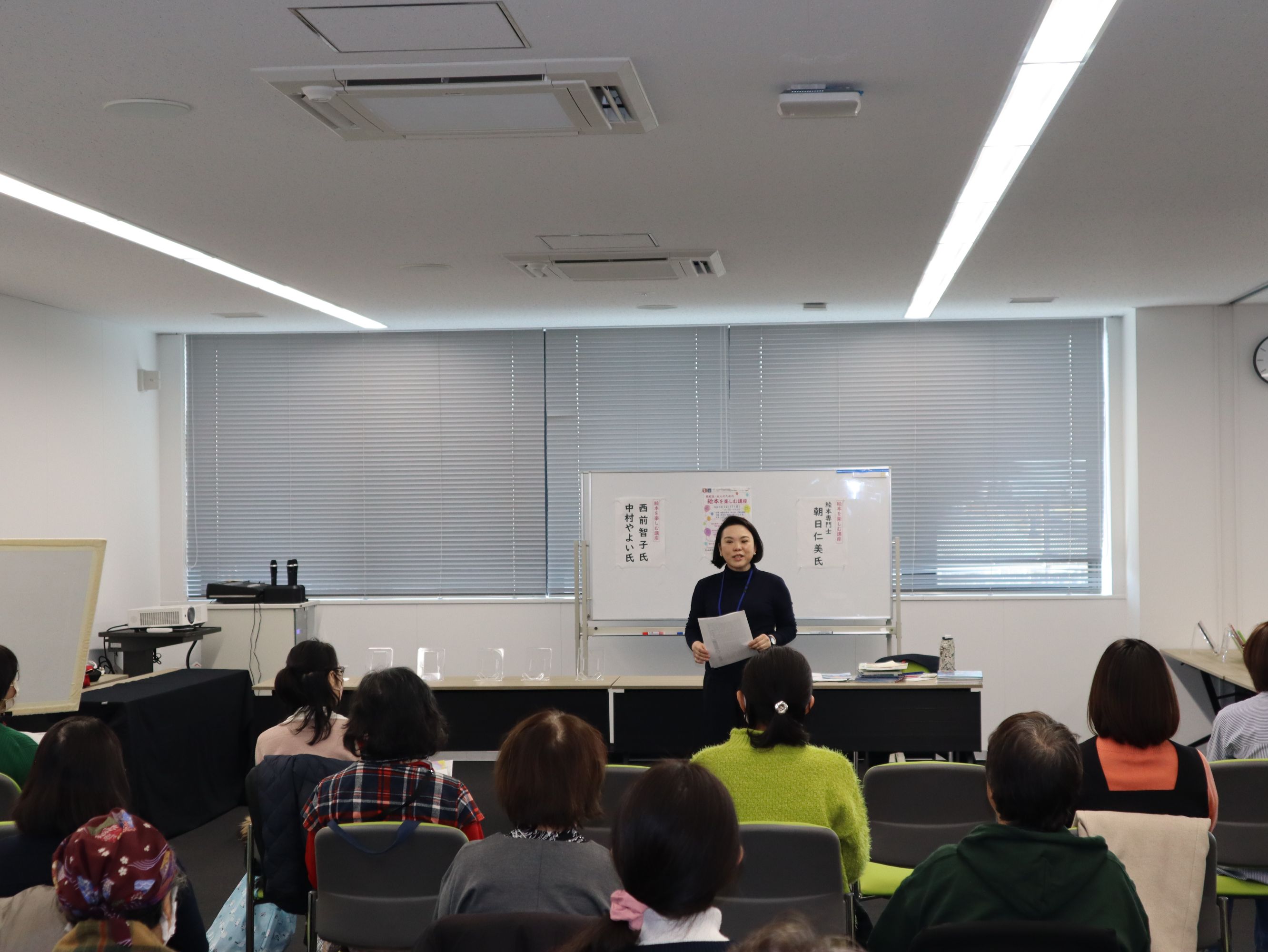 絵本というと、子どもの読むものというイメージがあるのですが、絵本は赤ちゃんから大人まで楽しめるものです。そこで、今回は、高校生から大人まで、自分が絵本を楽しみましょう、という講座を企画しました。高校生でも参加しやすいように、会場には、JR米原駅に直結する米原市役所の会議室をお借りしました。