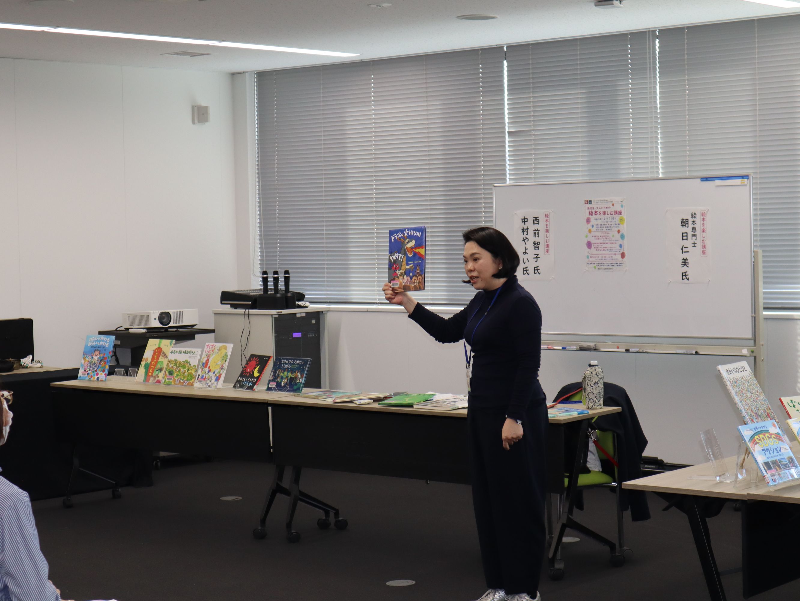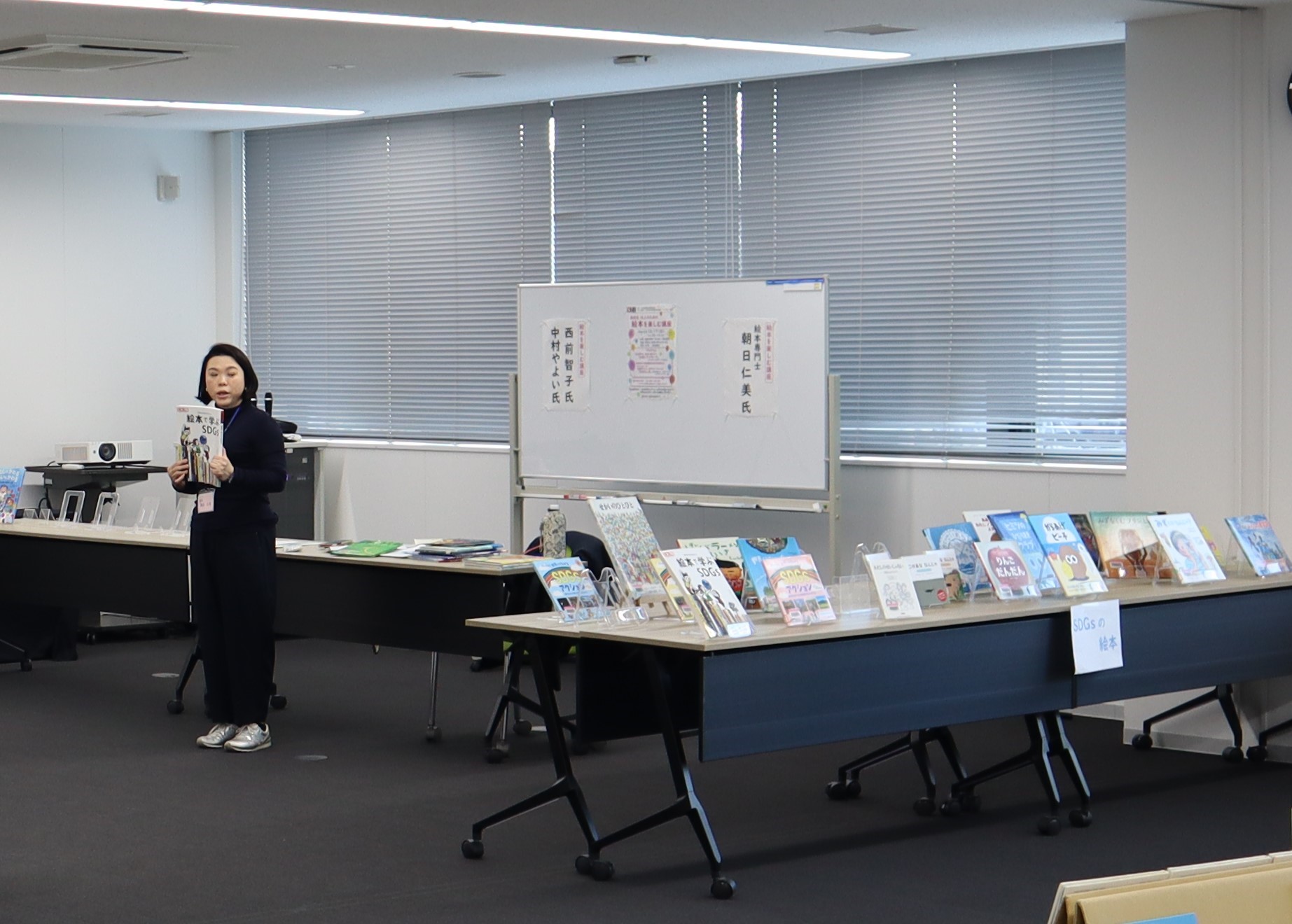 朝日仁美さんは、本学で養成講座を開講している「認定絵本士」より、より専門的な資格である「絵本専門士」として活動をなさっており、絵本を用いて、SDGsをより身近な事柄とするための活動もなさっておられます。そこで、最初に「絵本専門士」についてのお話をしていただき、その後、SDGsをテーマとして、大人のためのブックトークをしていただきました。また朝日さんにお薦めいただいたSDGsに関する本の展示も行いました。