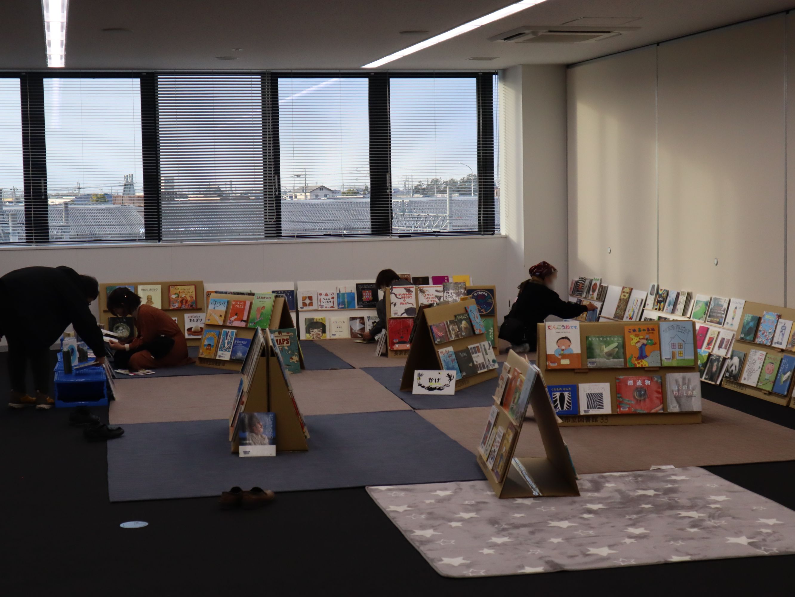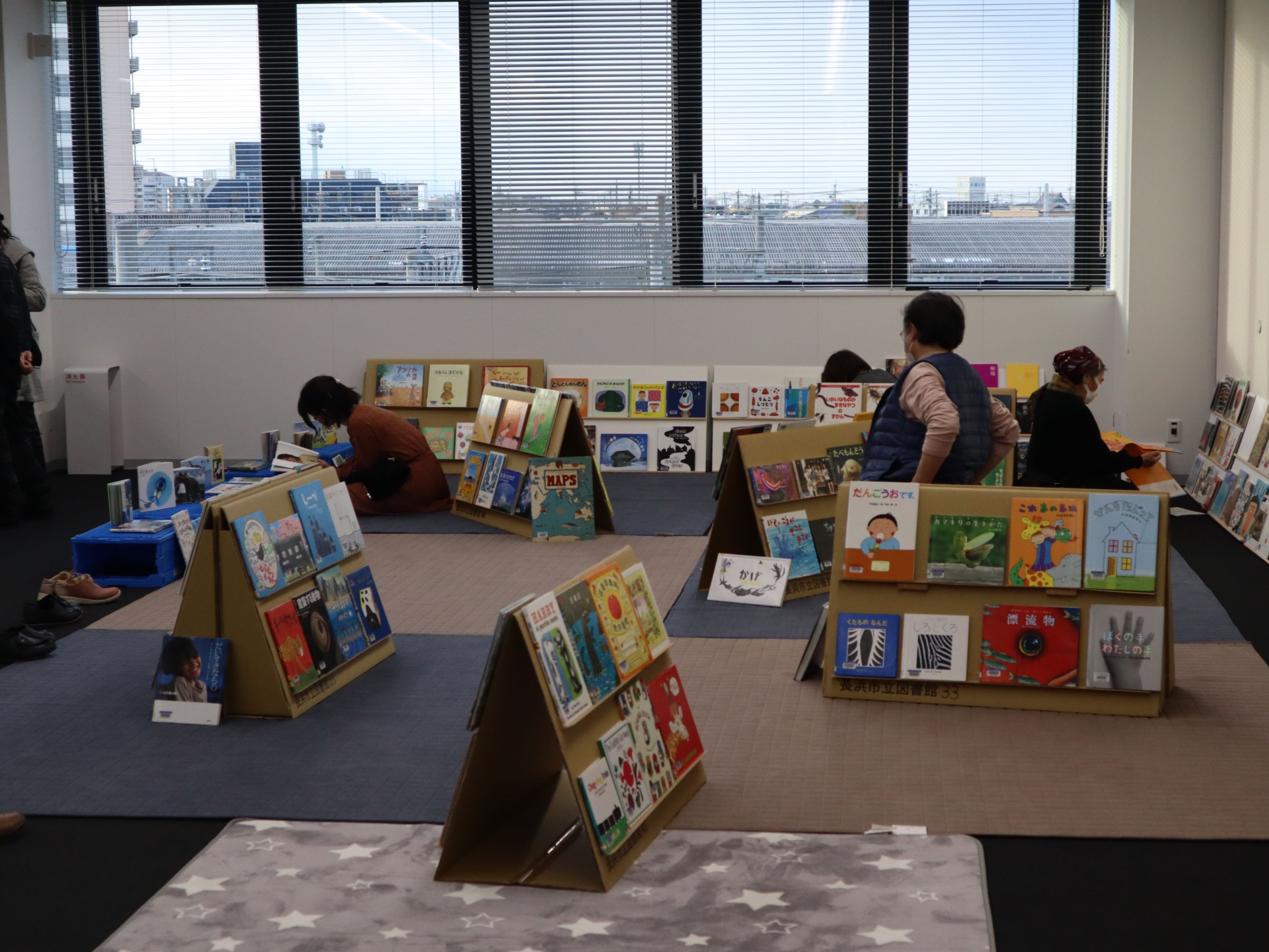 このようなプログラムとともに、プログラムの始まる前の午後1時から、終わった後も午後5時近くまで、長浜市立図書館からお借りした200冊以上の絵本を面展台において、手にとってみられるようにした、「絵の本ひろば」を開催しました。