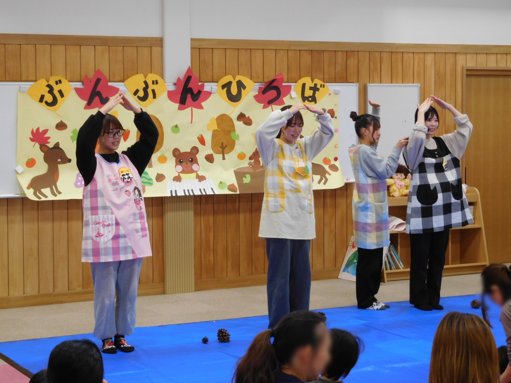 「朝の会」を行い、「ぶんぶんたいそう」で身体をほぐした後は、秋におすすめの「やきいもグーチーパー」「まつぼっくり」「大きな栗の木の下で」の手遊びを楽しみました。