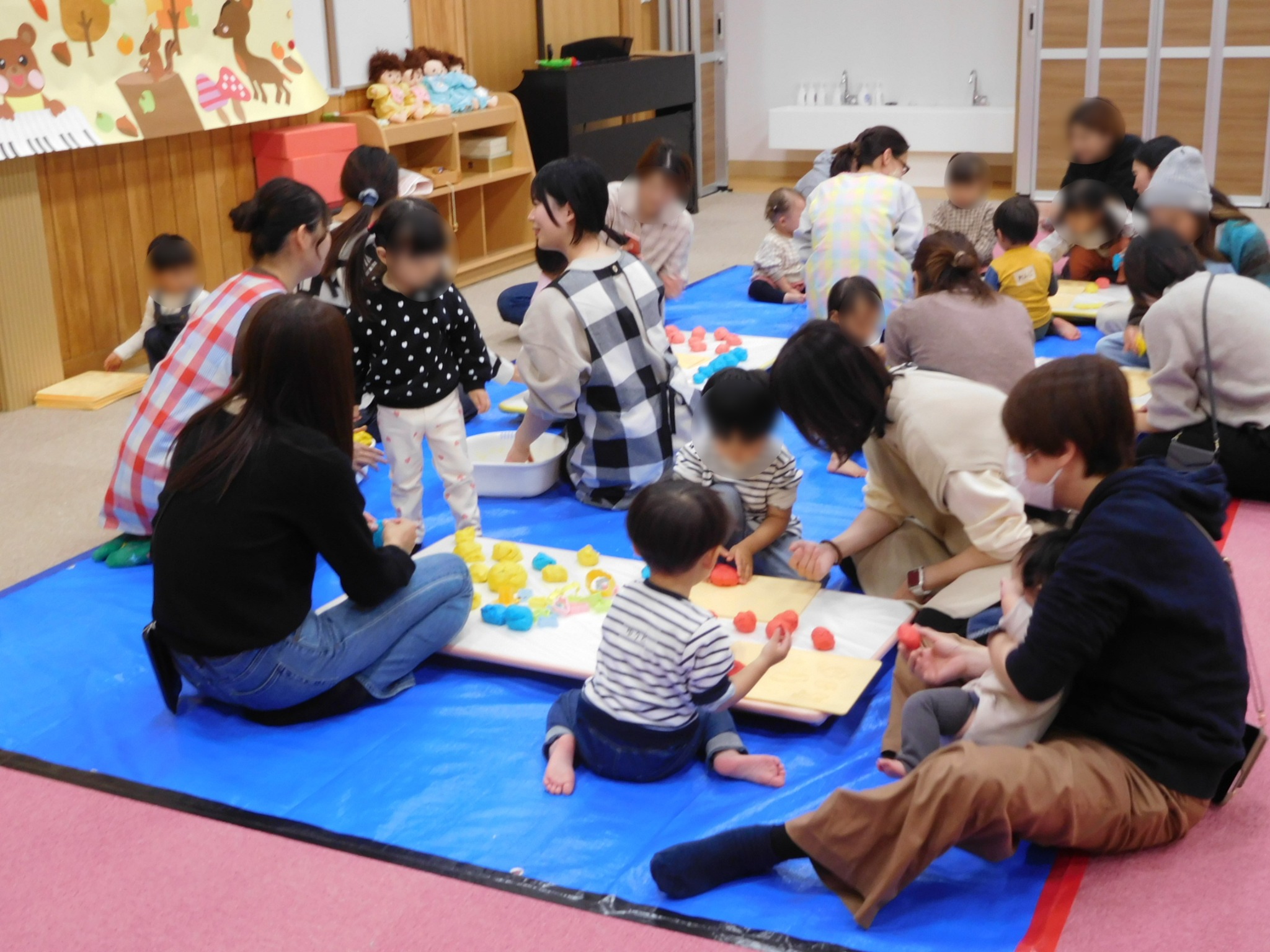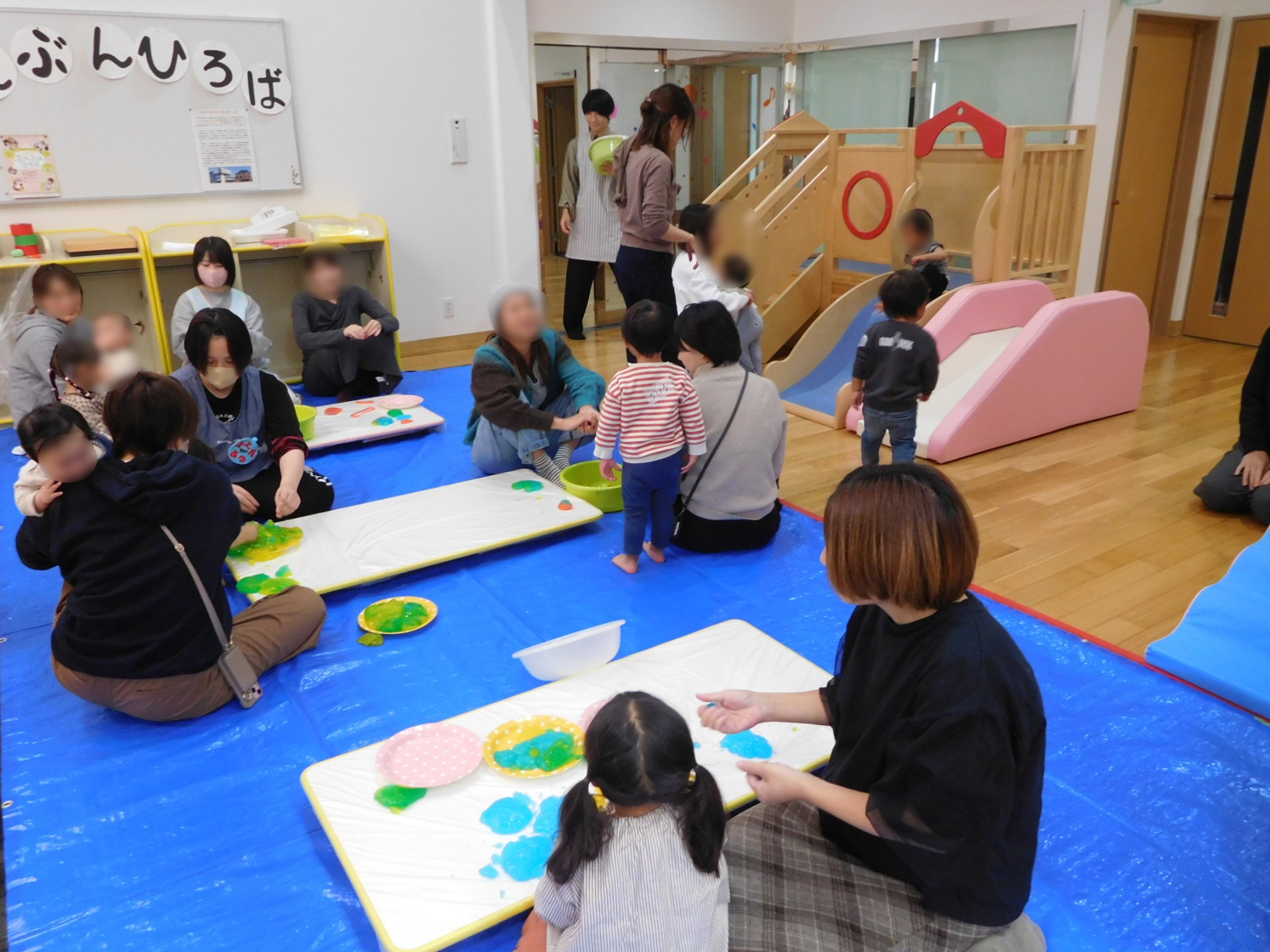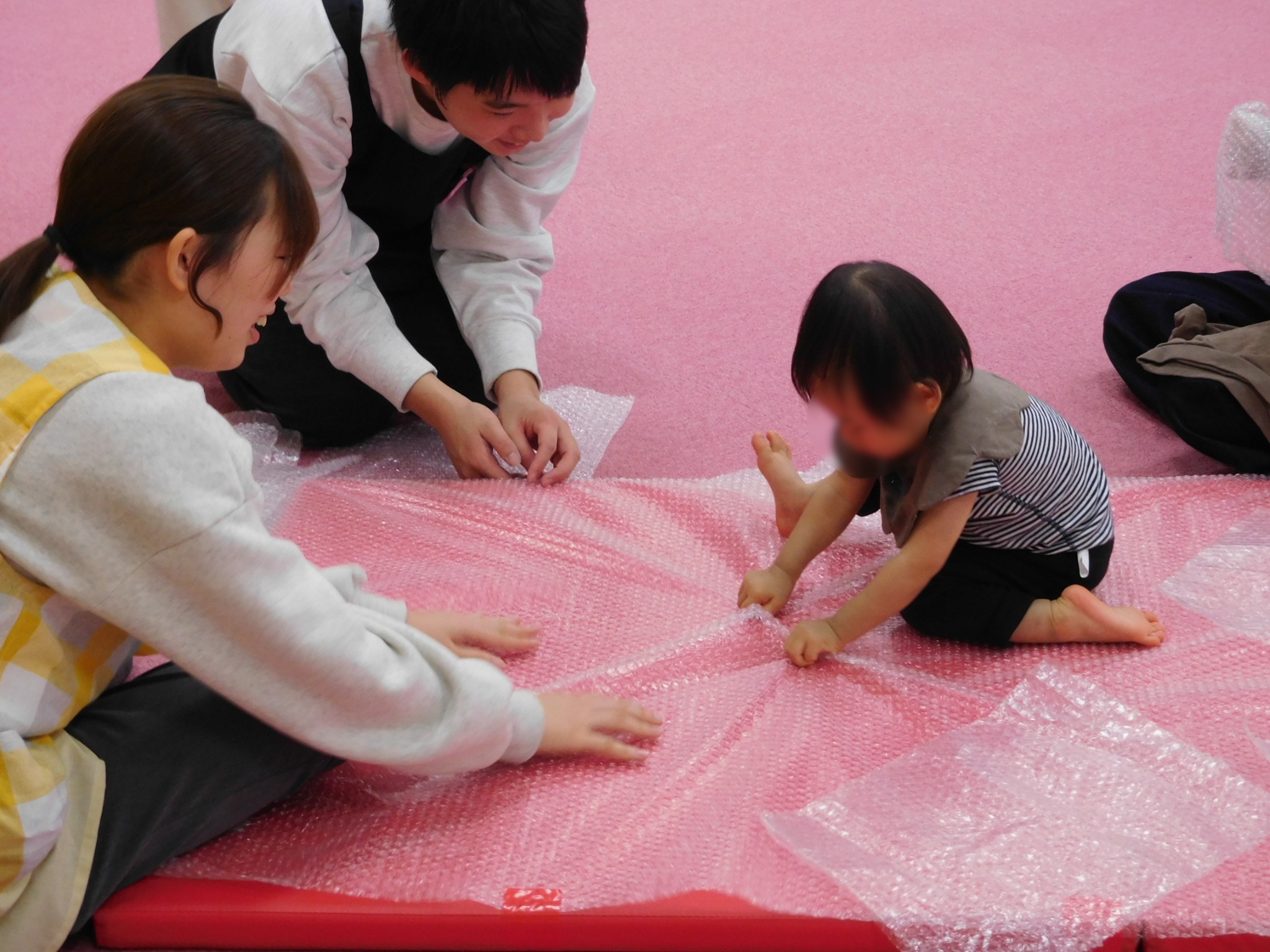 「小麦粉粘土」「スライム」「プチプチ」「新聞紙プール」のコーナーを準備しました。それぞれのコーナーで、親子でたっぷりと遊んでいただきました。