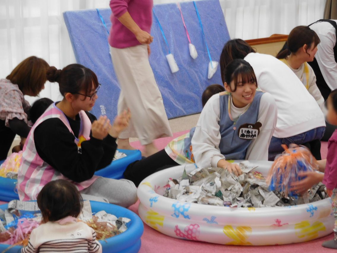 今回は、「さわってあそぼう」ということで、「様々な感触遊びを通して、親子で楽しい時間を過ごしていただく」をねらいに、学生が遊びを計画しました。前日準備では、1~3歳児さんが楽しめるように、小麦粉粘土やスライムの硬さを考え、試行錯誤しました。参加していただいた方からは、「普段できない遊びができて、楽しそうでした」などのうれしい感想をいただきました。