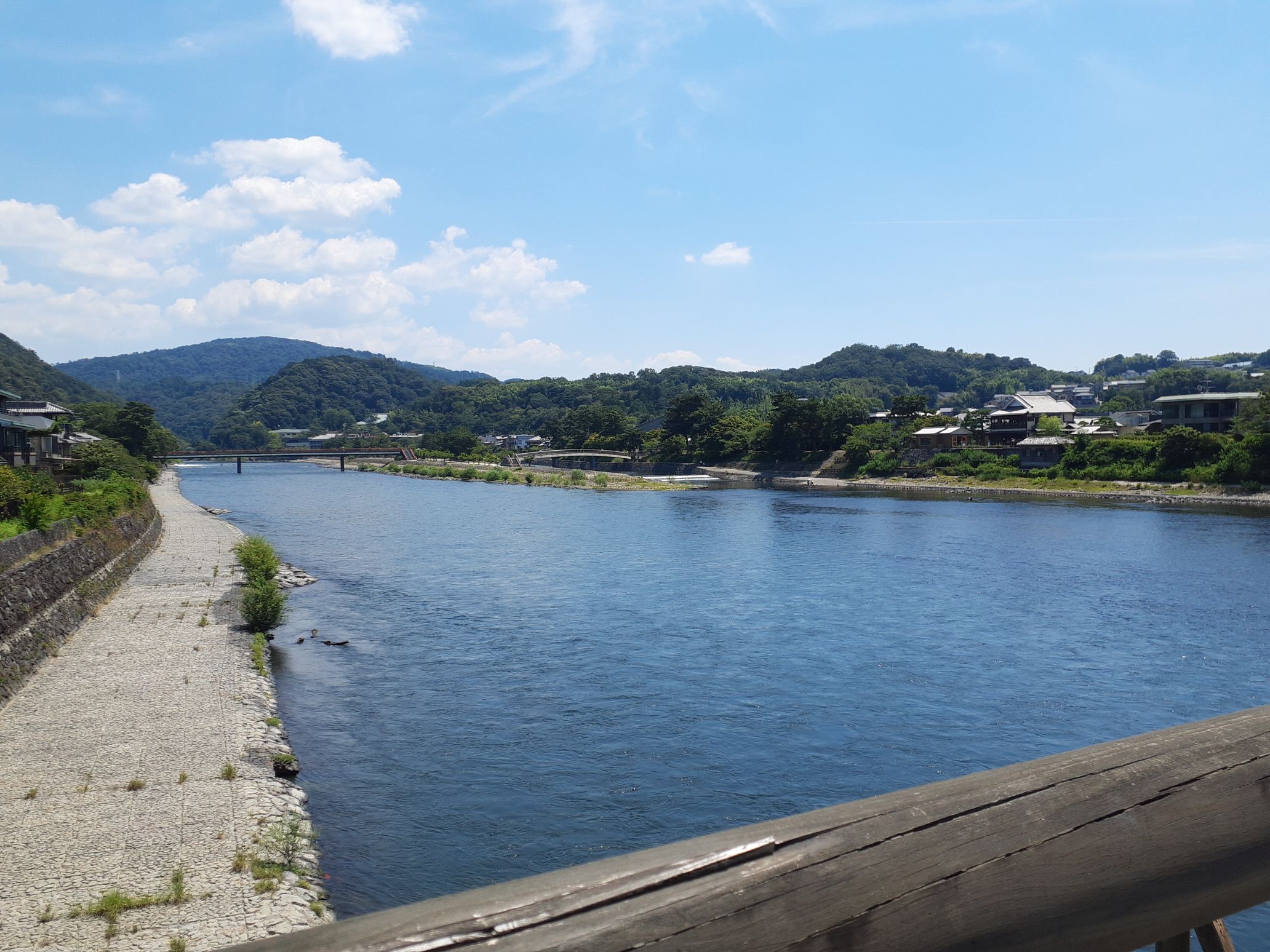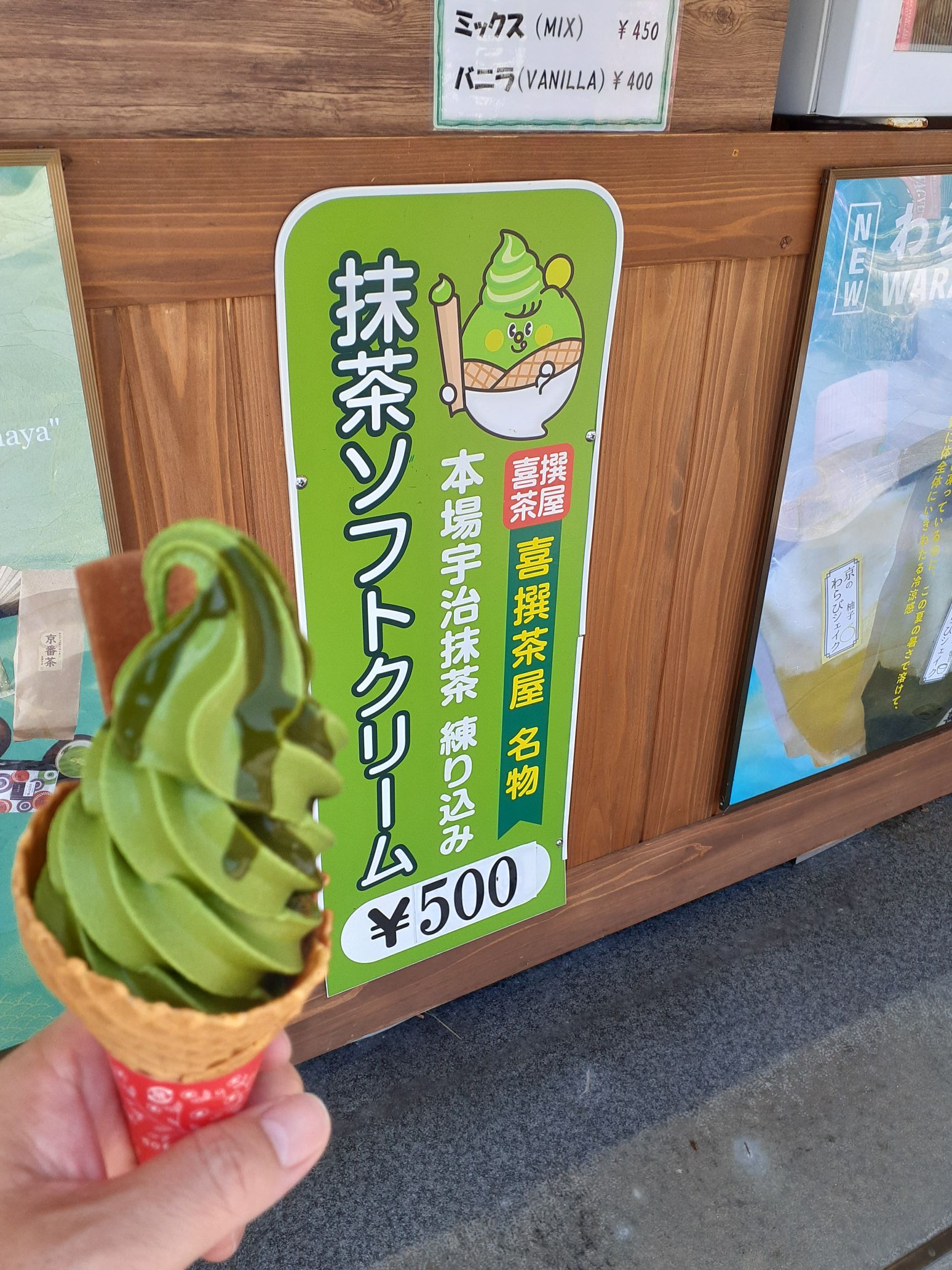 集合場所は、いつもの宇治川西岸「紫式部像」前!あまりの暑さに、宇治抹茶ソフトクリーム