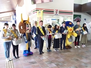 長浜警察署、長浜市役所、長浜地区交通安全協会および長浜地区安全運転管理者協会の方々と共に、啓発品の配布やマスコットキャラクターの着ぐるみを着用して、JR長浜駅利用者に対し交通安全を呼びかけました。