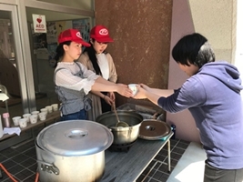 本学は1日目のサービスポイントであり、びわこ南10kmコースの参加者の昼食会場でもあったため、サービス品(お菓子、お漬物、飲み物)の他、和風わかめスープの提供を行いました。本学の学生スタッフは、本学に来られたウォーカーの皆様に少しでもくつろいで頂けるよう笑顔でお迎えし、できる限りのおもてなしをしました。また、三日月大造 滋賀県知事もイベントに参加され、本学サービスポイントにお立ち寄りいただき学生と写真撮影をして頂きました。