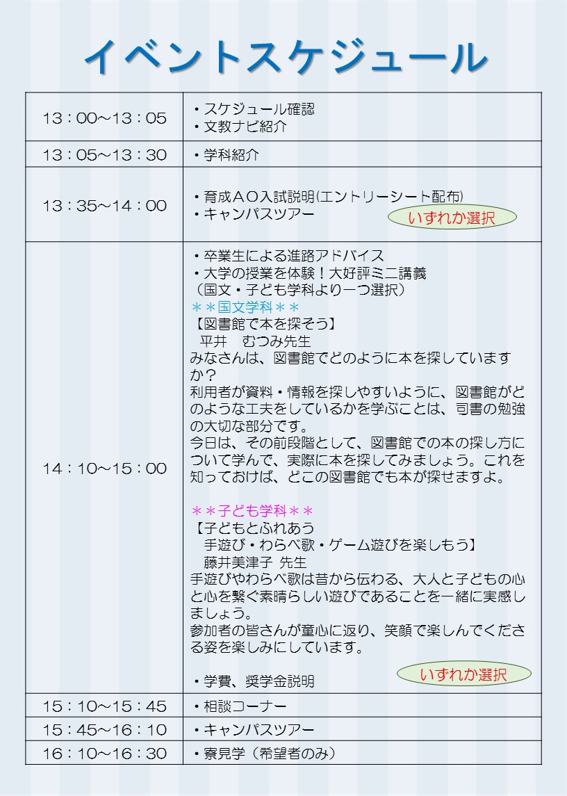 また、ミニ講義や文教ナビゲーターによるキャンパスツアー、入試説明会を行いました。
