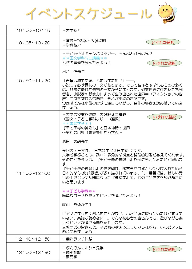 ・ミニ講義の2つともとても興味深かったです。2回目だったのであまり緊張せずに学校の中を見ることができました。学生さんや先生方が優しく接してくださったので、楽しく時間を過ごせました。次回もぜひ参加させていただきたいです。ミニ講義の、文学作品の冒頭には作品の世界観があらわれているという言葉がとても心に残り、また本を読むときには注目してみたいと思いました。ランチもとてもおいしかったです。