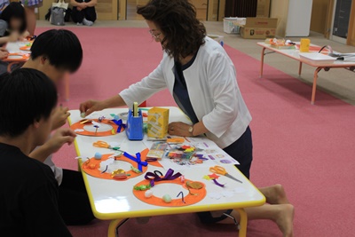 子ども学科では【知っているようで知らないハロウィンの世界を楽しんでみましょう】をテーマにハロウィンの雰囲気が味わえるカボチャのリース作りの体験を行いました。