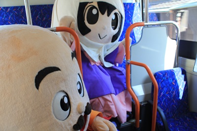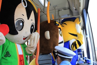 出動式では、本学学生が警察署マスコットキャラクターや長浜市のゆるキャラの着ぐるみを着用してバスに乗車後、巡回パレードに出発しました。パレードでは、警察車両等と一緒に市内を巡回し、交通安全運動の実施及び日ごろの交通安全への啓発を行いました。