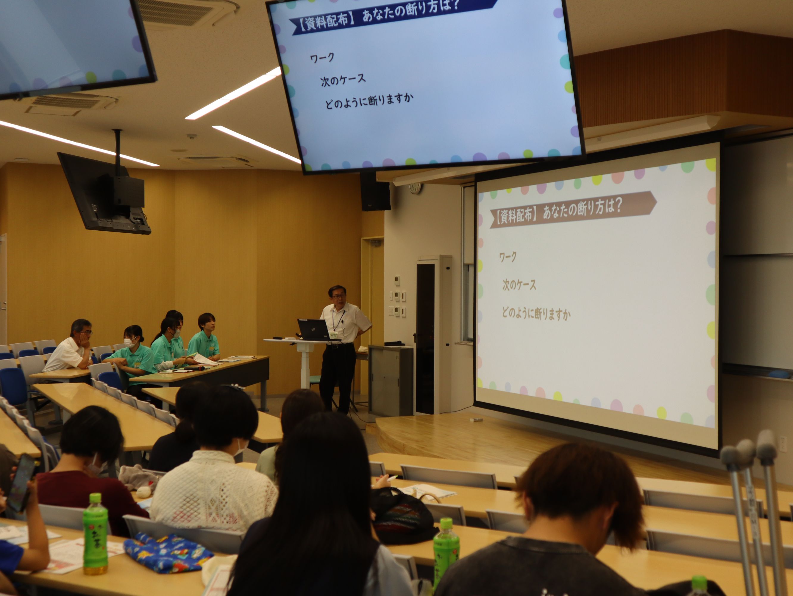 - 今回は、懇談会にて実際に大学に通っている方の声を聞き、どういったことをしているのかということを実際に聞くことができ、大学や実習の雰囲気を知ることができとても有意義な時間を過ごすことが出来ました。また、今回の講義では心理について改めて学ぶことができ、言い方ひとつで相手のことを尊重した言い方ができるのだと感じました。言い方を変えるだけで自分の素直な気持ちを相手が嫌な気持ちにならないように伝えることができると今回の講座で学ぶことが出来ました。今回のオープンキャンパスもありがとうございました。
