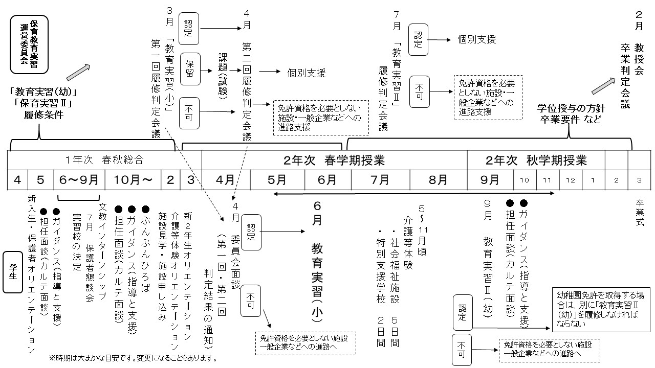 | 「保育実習Ⅰ」「保育実習Ⅱ」「教育実習(幼)」 | 1年生4月の実習ガイダンスにて、自分自身で選びます。 |